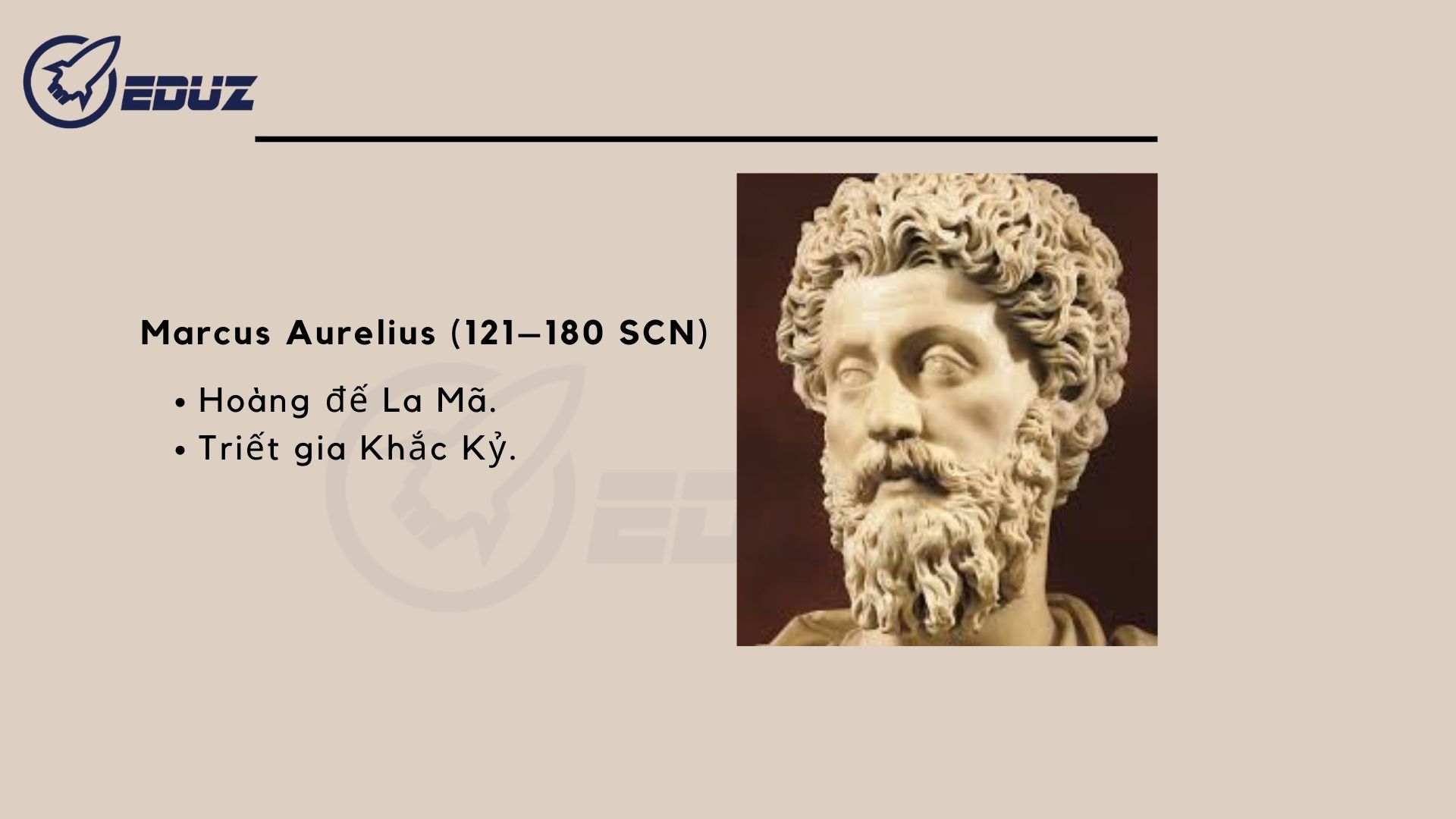 Marcus Aurelius (121–180 SCN) là hoàng đế La Mã và triết gia Khắc Kỷ, được biết đến qua tác phẩm Meditations. Ông khuyến khích rèn luyện sự tự chủ, trách nhiệm cá nhân và lòng khoan dung để sống một cuộc đời ý nghĩa và thanh thản.