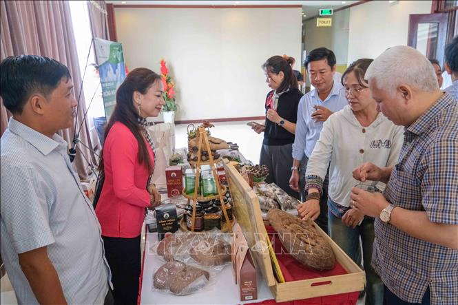 Chị Nương giới thiệu với khách hàng các sản phẩm nấm dược liệu do Nương Farm sản xuất . Ảnh Thanh Liêm - TTXVN