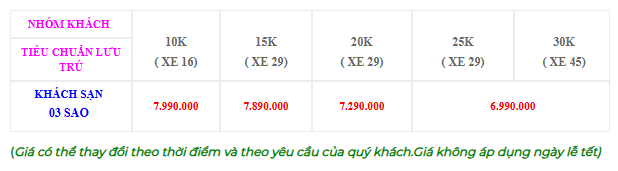Lưu trú: Khách sạn đạt tiêu chuẩn 03 sao (1 phòng/2-3 khách). Trang thiết bị đầy đủ tiện nghi;