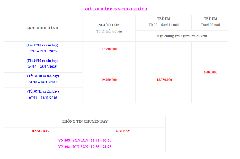 - 3 đêm khách sạn Seoul, tiêu chuẩn 2 người/phòng (hoặc tương đương).