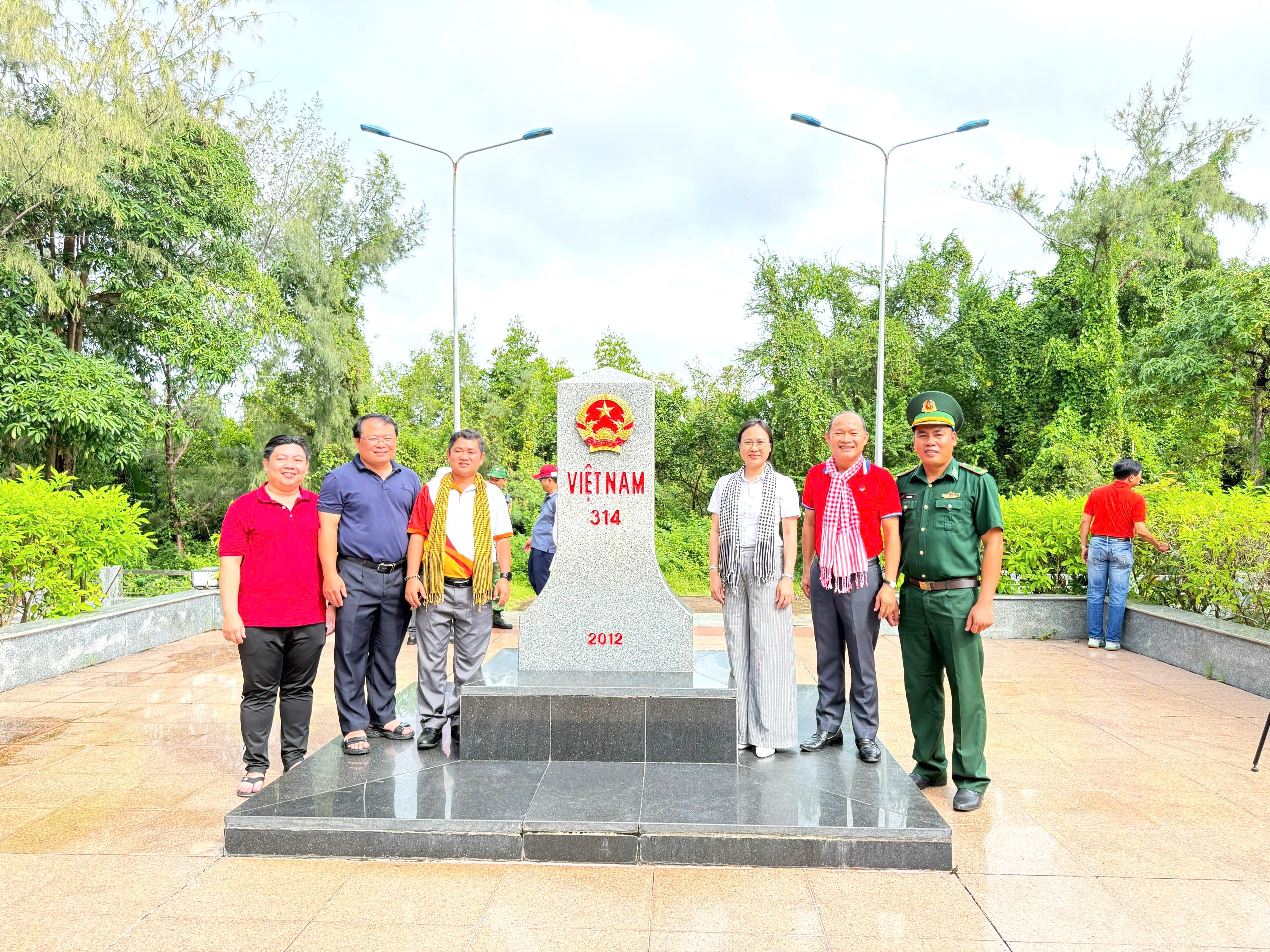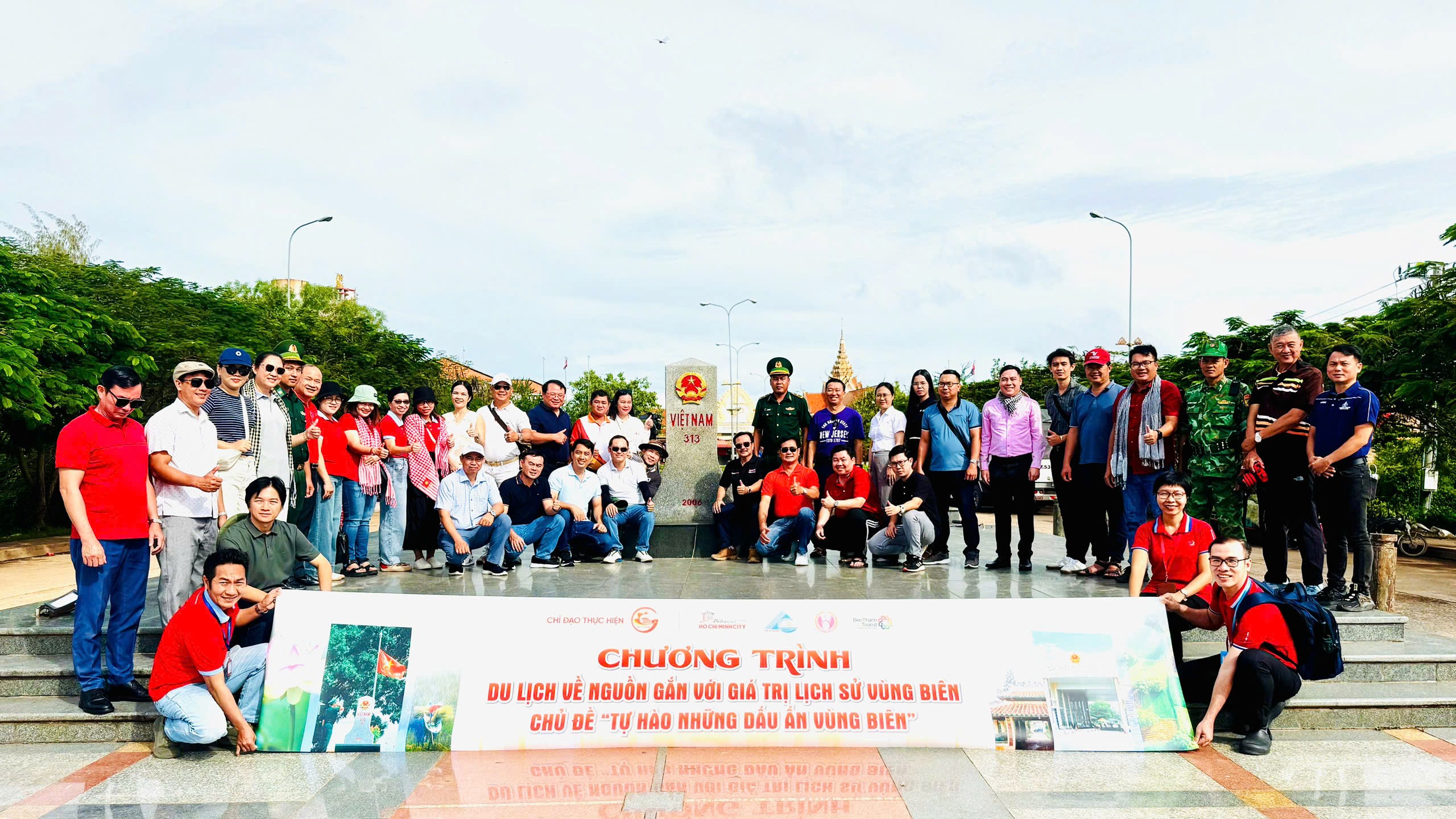 Tiếp nối hành trình, đoàn đến thăm Cột mốc 313 và Cột mốc 314 tại khu vực Cửa khẩu Quốc tế Hà Tiên. Đây là những cột mốc cuối cùng trên bộ của tuyến biên giới Tây Nam, khẳng định chủ quyền lãnh thổ và tình hữu nghị giữa hai nước Việt Nam - Campuchia. Tại đây, các thành viên được nghe giới thiệu về lịch sử hình thành, ý nghĩa của hệ thống mốc giới, đồng thời được giao lưu với các chiến sĩ biên phòng, nghe chia sẻ về công tác gìn giữ biên cương, bảo vệ từng tấc đất thiêng liêng của Tổ quốc.