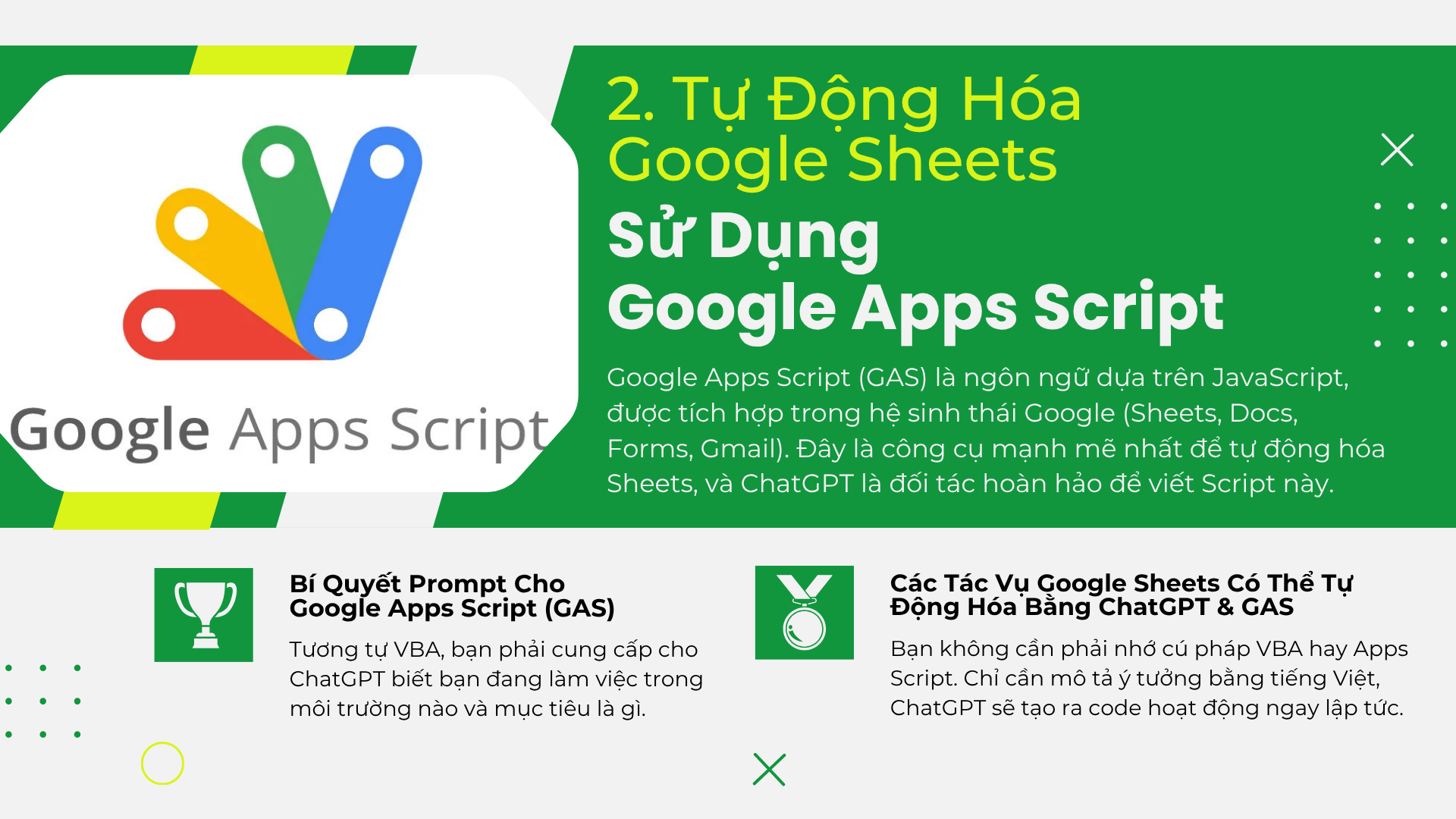Google Apps Script (GAS) là ngôn ngữ dựa trên JavaScript, được tích hợp trong hệ sinh thái Google (Sheets, Docs, Forms, Gmail). Đây là công cụ mạnh mẽ nhất để tự động hóa Sheets, và ChatGPT là đối tác hoàn hảo để viết Script này.
