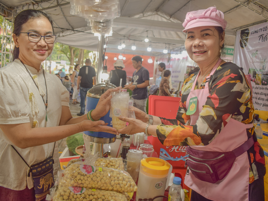 Giữa không gian đầy ắp sắc xanh và nụ cười, hình ảnh những người phụ nữ Đồng Tháp trong tà áo truyền thống, ân cần mời khách thưởng thức từng món ngon dân dã, khiến gian hàng trở thành một điểm dừng chân đầy ấm áp.