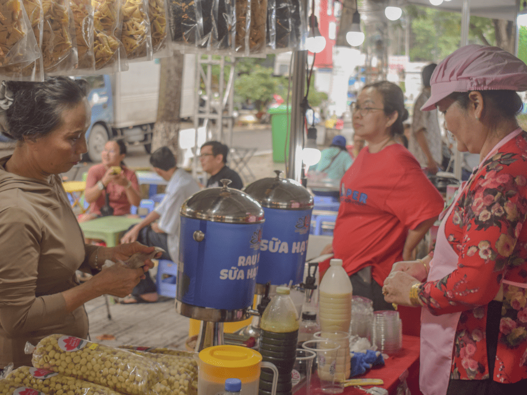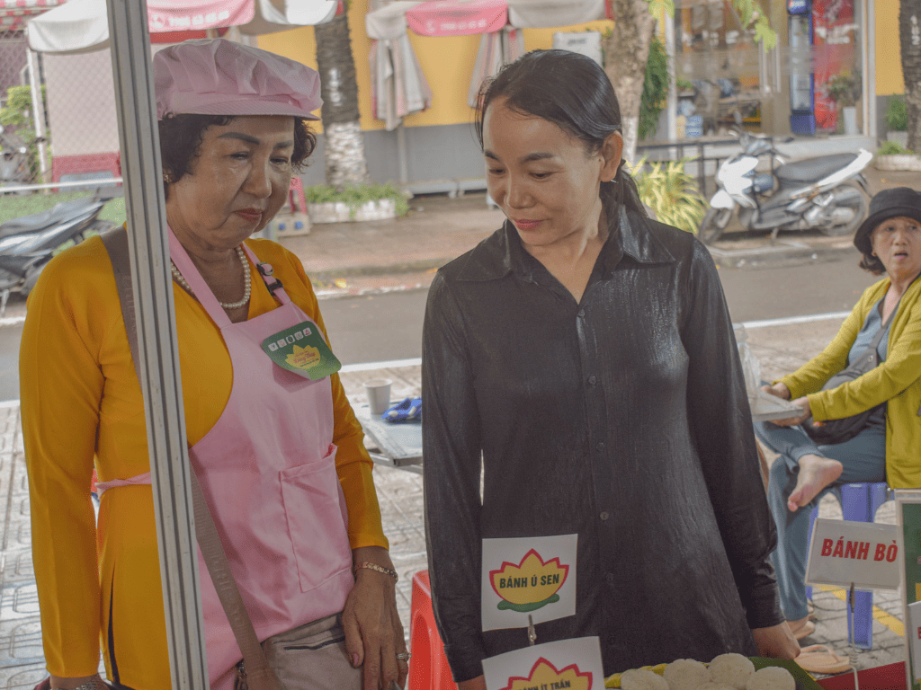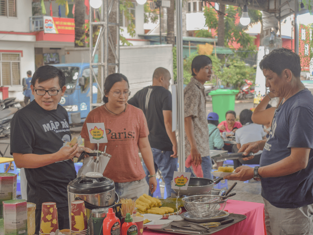 Trong làn nhạc lễ hội vui tươi, hương thơm của các món chay từ sen lan tỏa khắp khu vực. Gian hàng Vườn Dừa Út Khuê và Công ty Cổ phần Ecohome Đồng Tháp mang đến những sắc màu ẩm thực đặc trưng của quê hương Đồng Tháp – mộc mạc mà tinh tế.