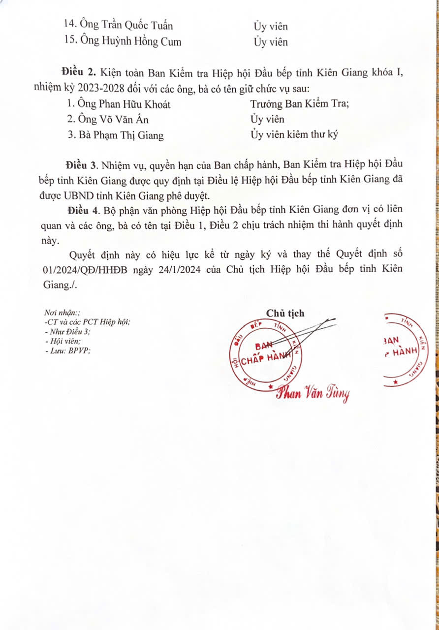 Quyết định cho phép đổi tên Hiệp hội Đầu bếp tỉnh An Giang