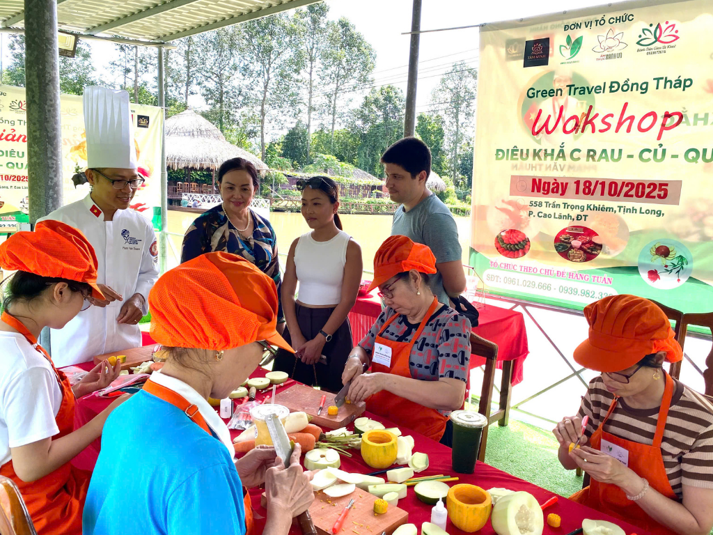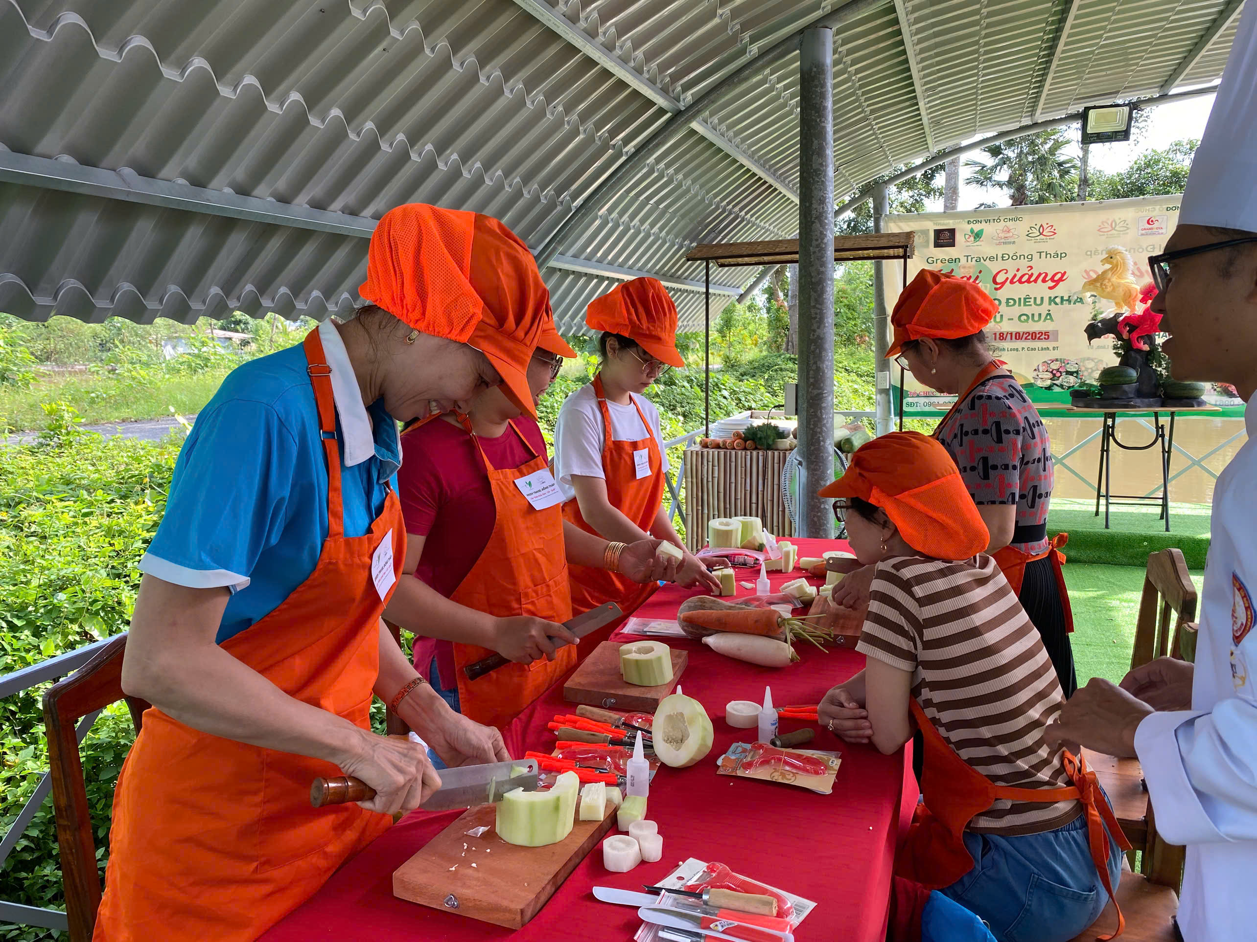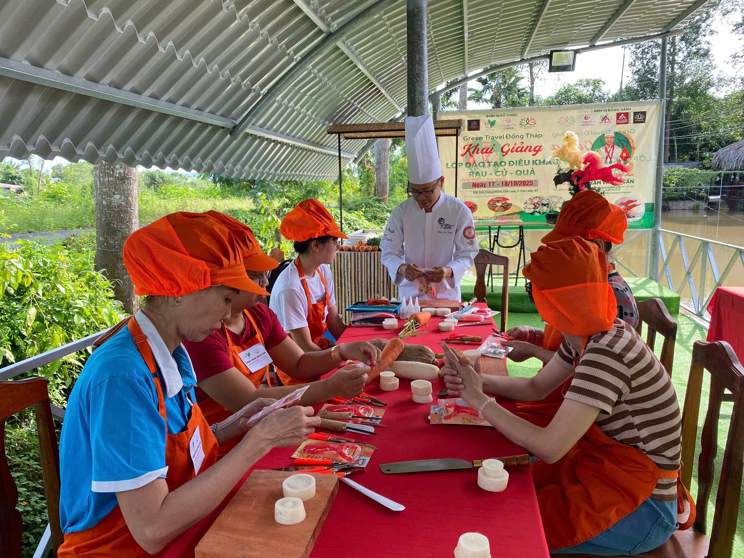 Ngày 17/10/2025, tại Khu du lịch vườn dừa Út Khuê, Green Travel Đồng Tháp hân hoan chào đón Khóa 2 lớp Điêu khắc Rau Củ Quả. Tiếp nối niềm vui từ khóa đầu tiên, khóa 2 trở lại với chủ đề mới mẻ: “Trang trí mô hình – Ứng dụng cho trang trí đĩa và bàn ăn”, mang đến bầu không khí rộn ràng và nhiều trải nghiệm đáng nhớ cho học viên.