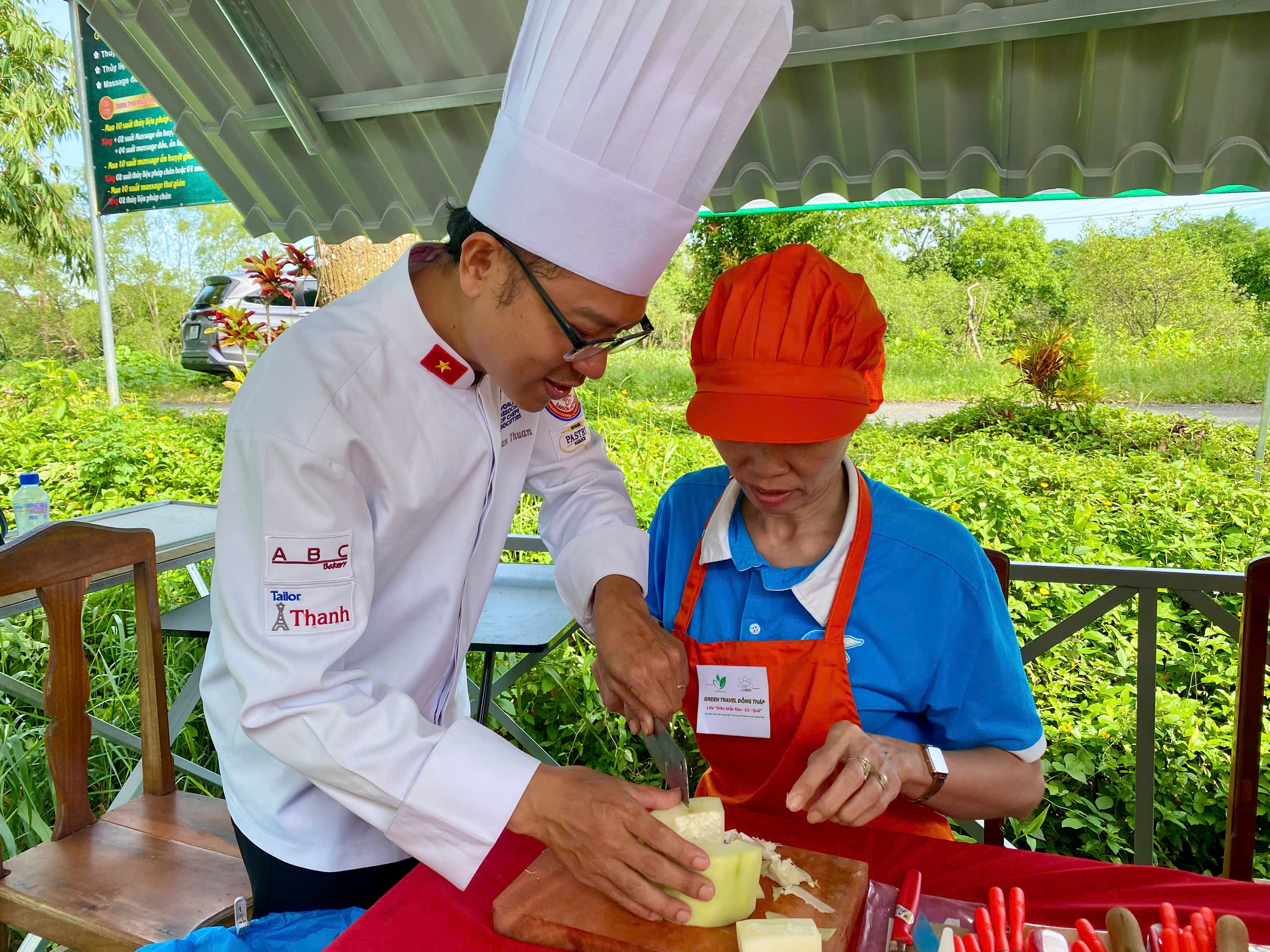 Đồng hành cùng khóa học, thầy Phạm Văn Thuấn, với kinh nghiệm và niềm đam mê nghệ thuật điêu khắc, đã truyền lửa và kiến thức đến từng học viên, giúp họ biến những nguyên liệu dân dã thành những tác phẩm tinh tế, góp phần nâng tầm giá trị ẩm thực Việt.