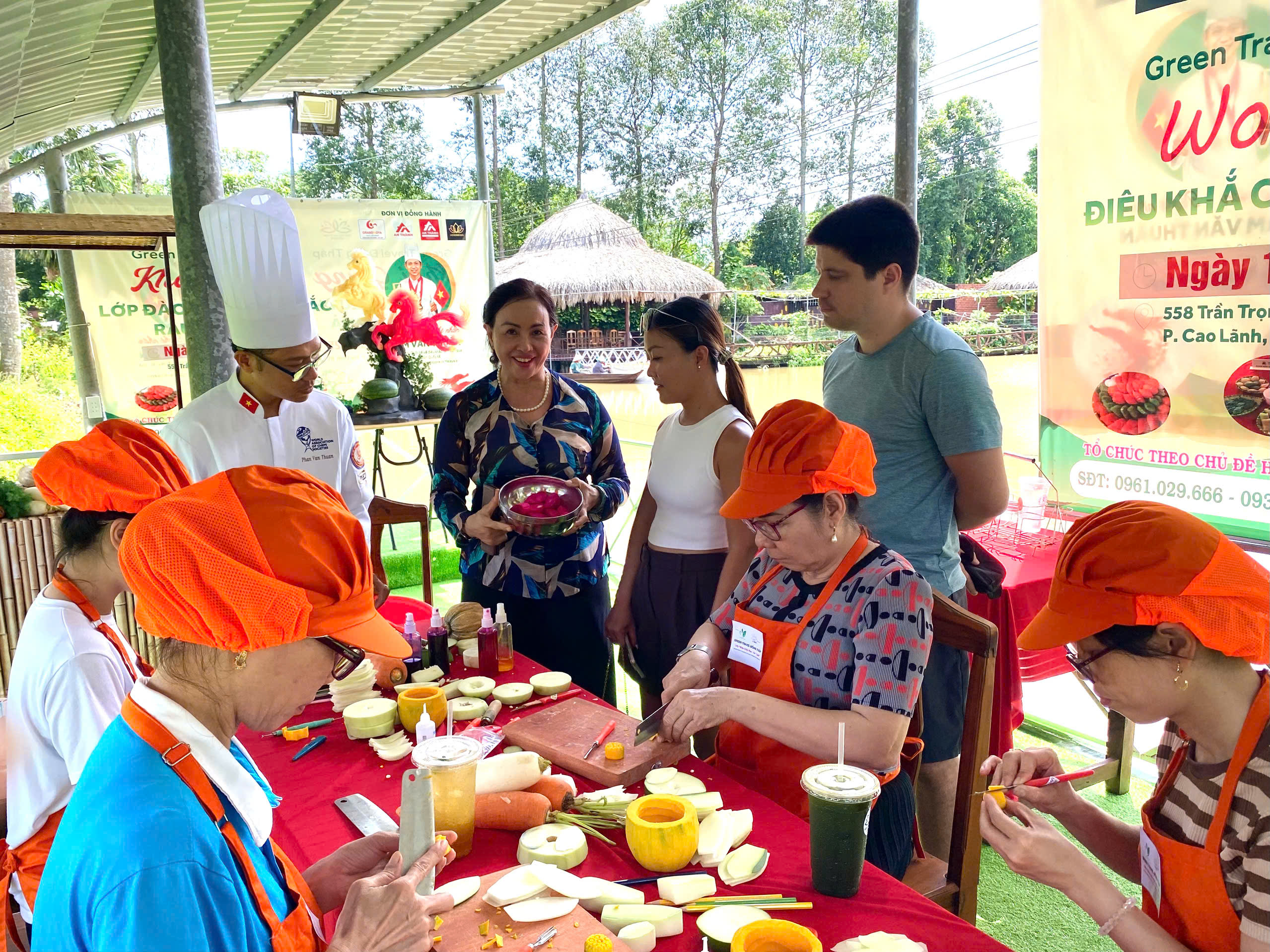 Buổi khai giảng diễn ra trong bầu không khí háo hức, với sự tham gia đầy vui tươi của học viên đến từ nhiều tỉnh, thành phố lớn, cùng sự góp mặt của chị em Hội Liên hiệp Phụ nữ phường Cao Lãnh. Đặc biệt, lớp học còn thu hút sự quan tâm của cả du khách quốc tế – minh chứng cho sức hút của nghệ thuật điêu khắc rau củ quả.