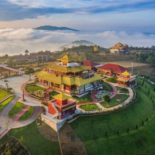 Mới bước vào khuôn viên chùa, bạn sẽ lập tức choáng ngợp với kiến trúc khối lập phương dát vàng rực rỡ của công trình này. Không giống như vẻ xa hoa kiểu Đông Nam Á của chùa Thái hay Campuchia, kiến trúc Mật Tông Tây Tạng đơn giản hơn nhiều và mang vẻ đẹp huyền bí rất riêng. Các vách tường vàng óng quanh chùa là điểm “sống ảo" nổi tiếng nhất ở đây. Bên cạnh đó, bạn cũng có thể dạo quanh khuôn viên rộng lớn bên ngoài, check-in ở sân thượng lộng gió hoặc vườn cây trong chùa,...