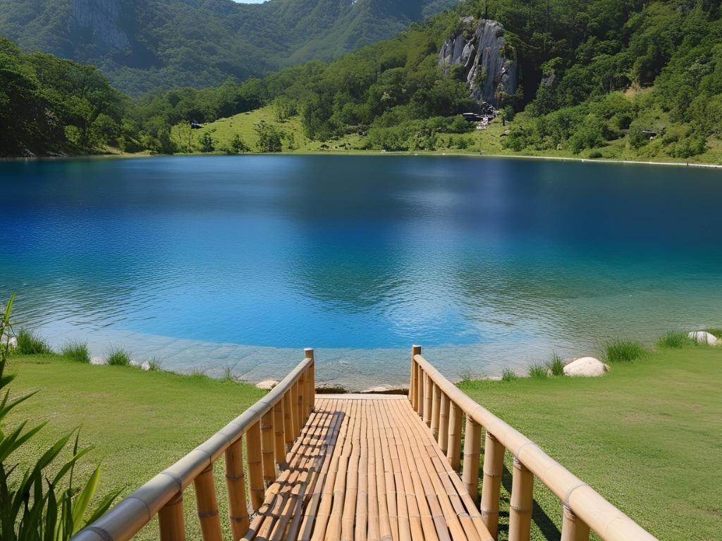 Dưới chân núi có hồ nước trong xanh, tạo nên một khung cảnh sơn thủy hữu tình. Hồ nước là nơi du khách có thể thư giãn, tận hưởng không khí trong lành. Hồ có diện tích khoảng 20m2 và chu vi khoảng 720 mét, có một sàn tre ra hồ rộng rãi và thoải mái để du khách tự do chụp hình với mặt hồ trong xanh, phản chiếu bóng núi và cây cối xung quanh, tạo nên một bức tranh thiên nhiên tuyệt đẹp.