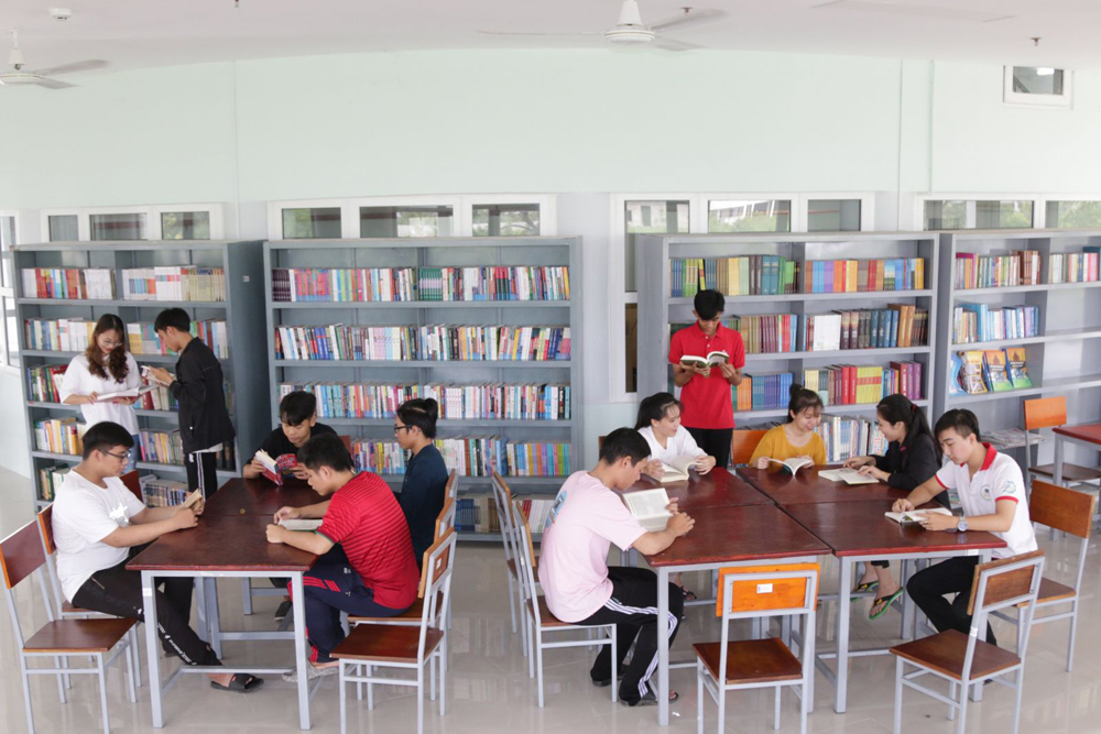 Thư viện có trên 1.676 đầu sách giấy, gần 105.907 tài liệu số (bao gồm nguồn thư viện số liên kết với Trường Đại học Nha Trang), hơn 280 cuốn luận văn, luận án và hàng trăm loại báo, tạp chí và ấn phẩm. Có 4 phòng đọc sách, 01 phòng đọc báo-tạp chí, 01 phòng đọc mở, 01 phòng mượn với diện tích 1200 m2 gồm 02 chỗ đọc sách, một phòng máy tính tra cứu Internet. Ngoài ra, Thư viện cũng nhận được sự tạo điều kiện của thư viện số Trường Đại học Nha Trang trong việc chia sẻ nguồn tài liệu chuyên ngành và hàng năm có 1.200 lượt sinh viên sử dụng từ nguồn tài liệu này.