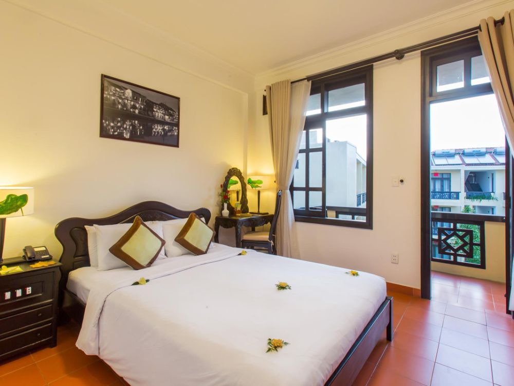 - Hệ thống phòng Ancient House Suite: Phong cách Việt Nam với giường đôi và sân thượng nhìn xuống hồ bơi thoáng mát và vườn.