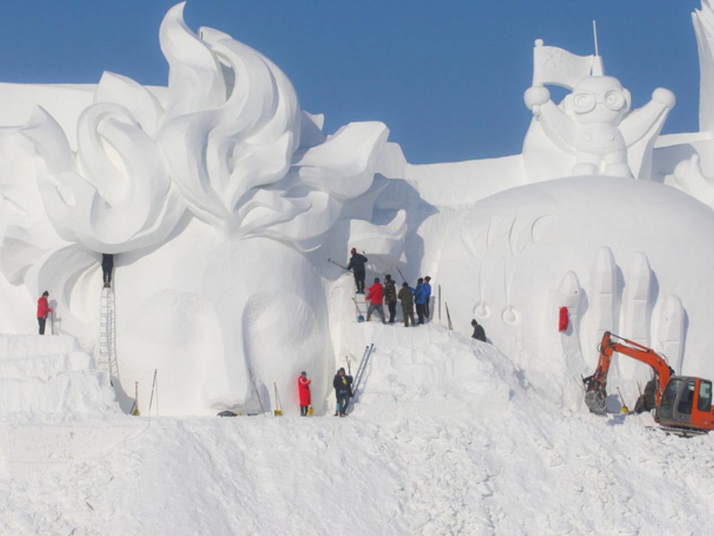 Nhóm công nhân vận chuyển băng về địa điểm tổ chức triển lãm. Theo CNN, gần 110.000 mét khối băng và 120.000 mét khối tuyết đã được sử dụng để xây dựng các công trình.