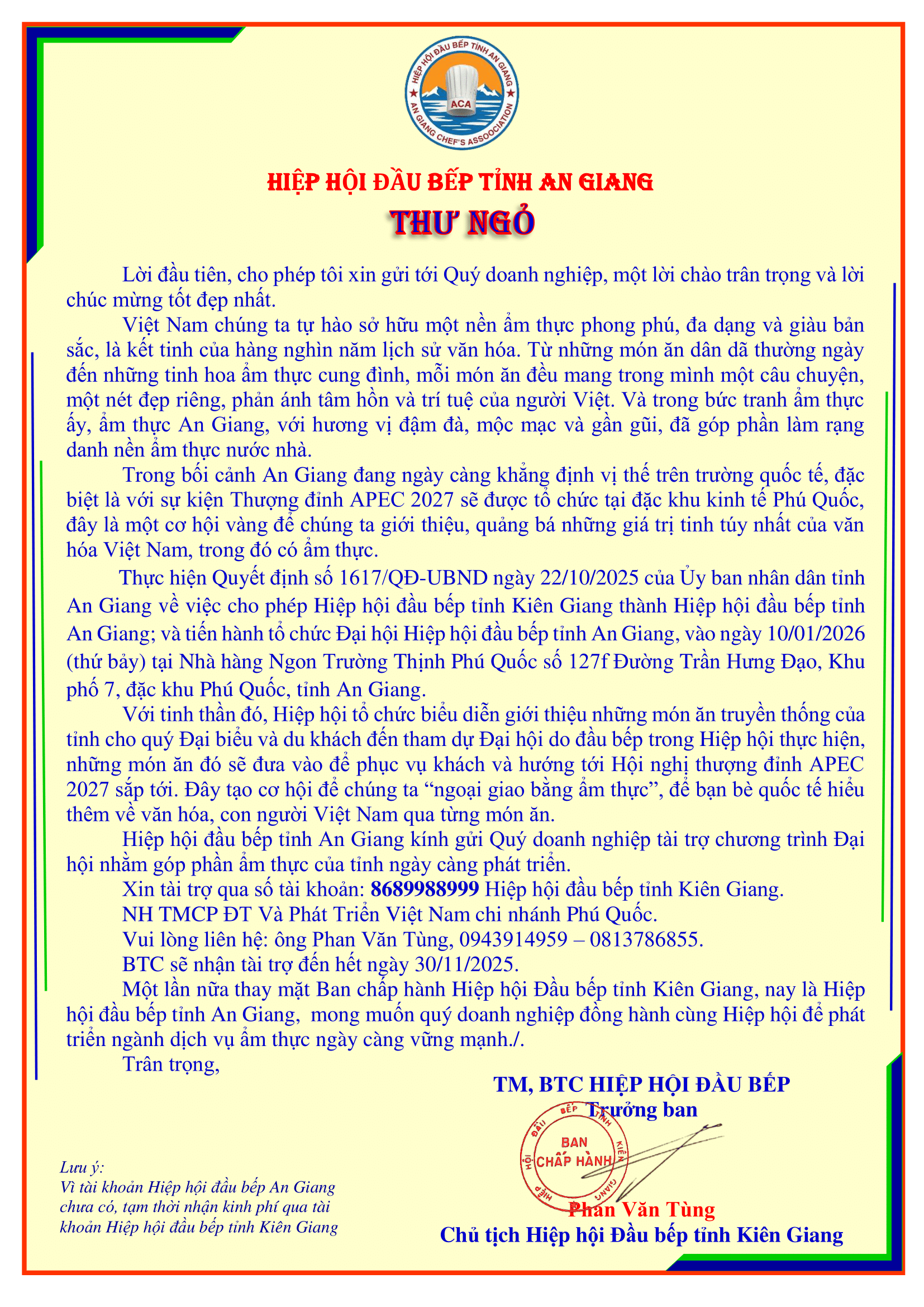 - Số tài khoản: 8689988999 – Hiệp hội Đầu bếp Tỉnh Kiên Giang