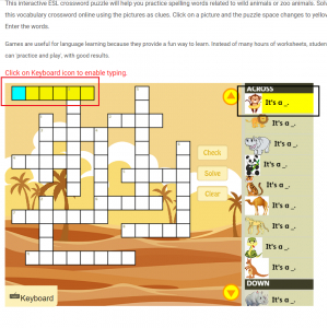 Bước 5: Để giải được ô chữ, bạn nhấp vào từng ô chữ tương ứng (màu đỏ) và khung bên trái có các hình ảnh (màu đen) sẽ phát ra âm thanh về từ vựng để gợi ý cho các bạn (Hình 4 bên trên). Nhấp vào một bức tranh và không gian câu đố chuyển sang màu vàng. Nhập các từ.