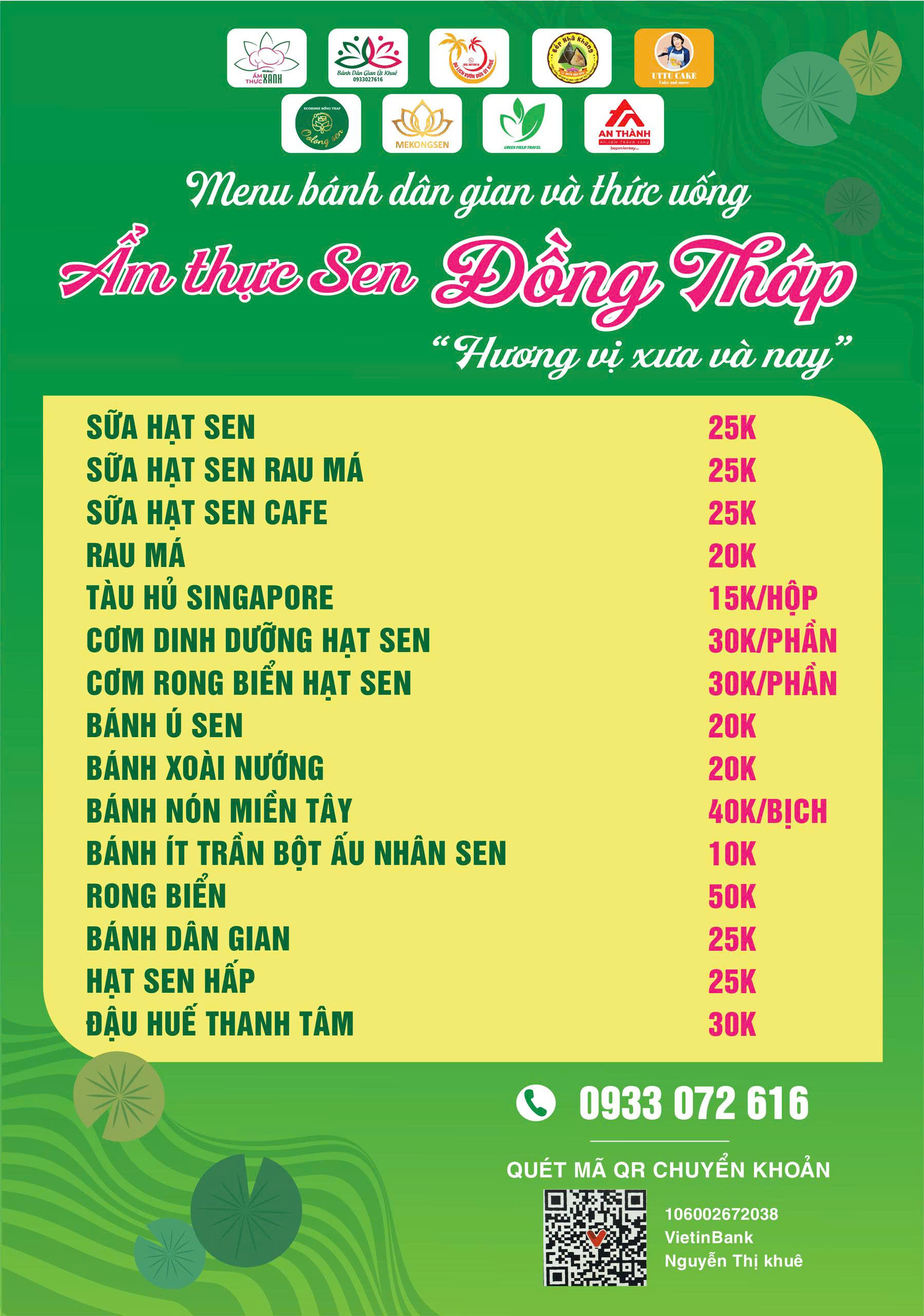 Từ chiếc bánh Ít Trần Bột Ấu dẻo thơm, đến bánh Xoài Nướng Nhân Hạt Sen sự sáng tạo độc đáo, kết hợp hương vị dân dã với nét hiện đại. Sữa Hạt Sen Cà Phê vị cà phê đậm đà hòa quyện cùng sự thanh mát, bổ dưỡng của sen, Sữa Hạt Sen – thức uống mát lành, vừa giải nhiệt vừa chăm sóc sức khỏe,... Tất cả đều được làm nên bằng sự khéo léo, giữ trọn hồn quê mộc mạc. Đây không chỉ là món ăn, mà còn là lời nhắc nhớ về những buổi chiều quê, nơi bàn tay mẹ, bà tỉ mẩn gói ghém yêu thương trong từng chiếc bánh.