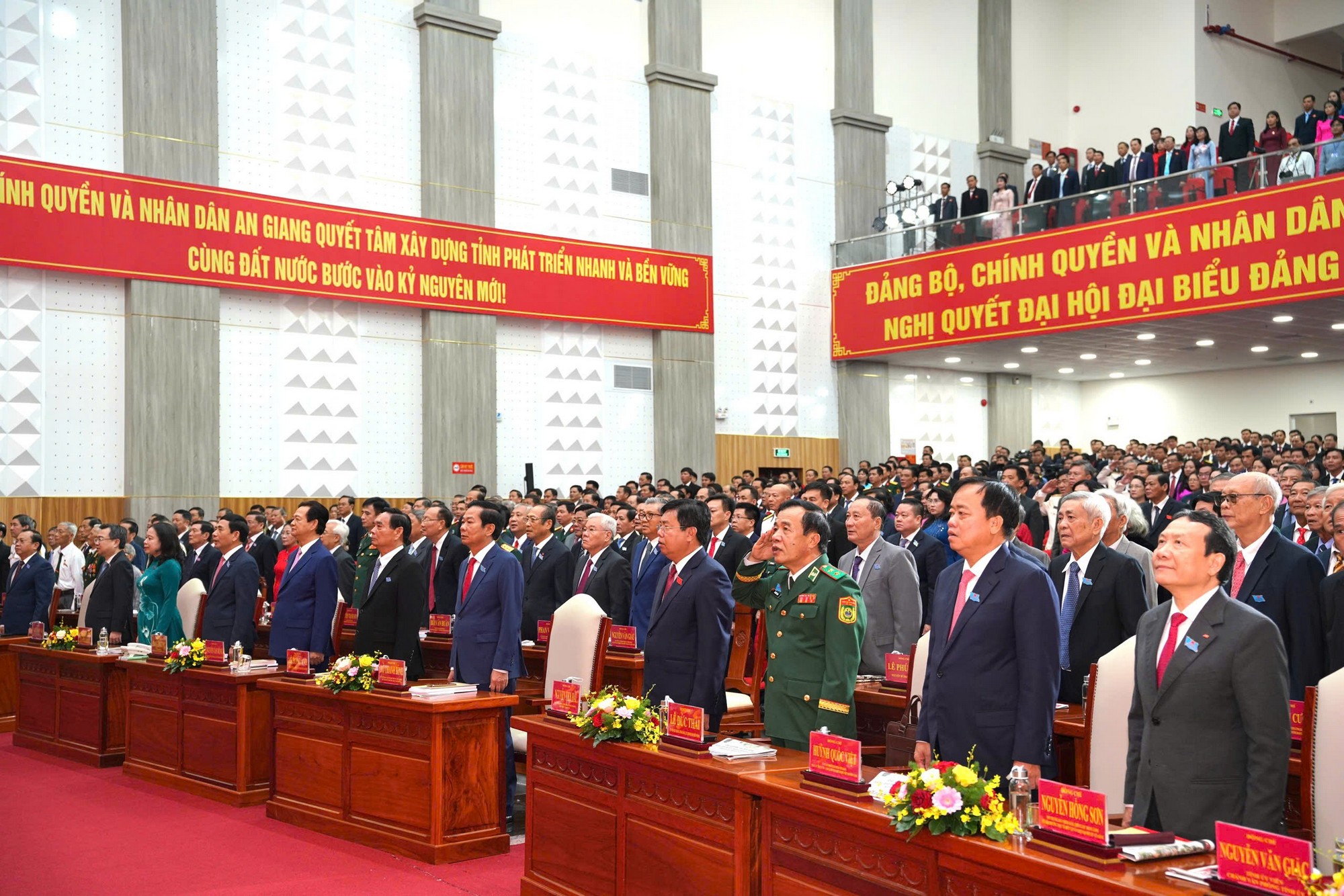 Các đại biểu thực hiện nghi lễ chào cờ tại Đại hội đại biểu Đảng bộ tỉnh An Giang lần thứ I, nhiệm kỳ 2025 – 2030