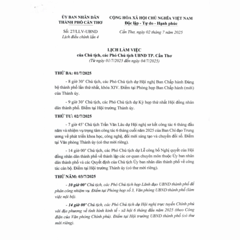 Lịch Làm Việc Của Chủ Tịch, Các Phó Chủ Tịch UBND Thành Phố Cần Thơ Từ Ngày 01/7/2025 Đến Ngày 04/7/2025