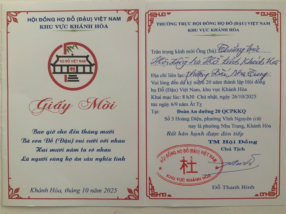 Giấy mời tham dự Kỷ niệm 20 năm thành lập Hội đồng họ Đỗ (Đậu)