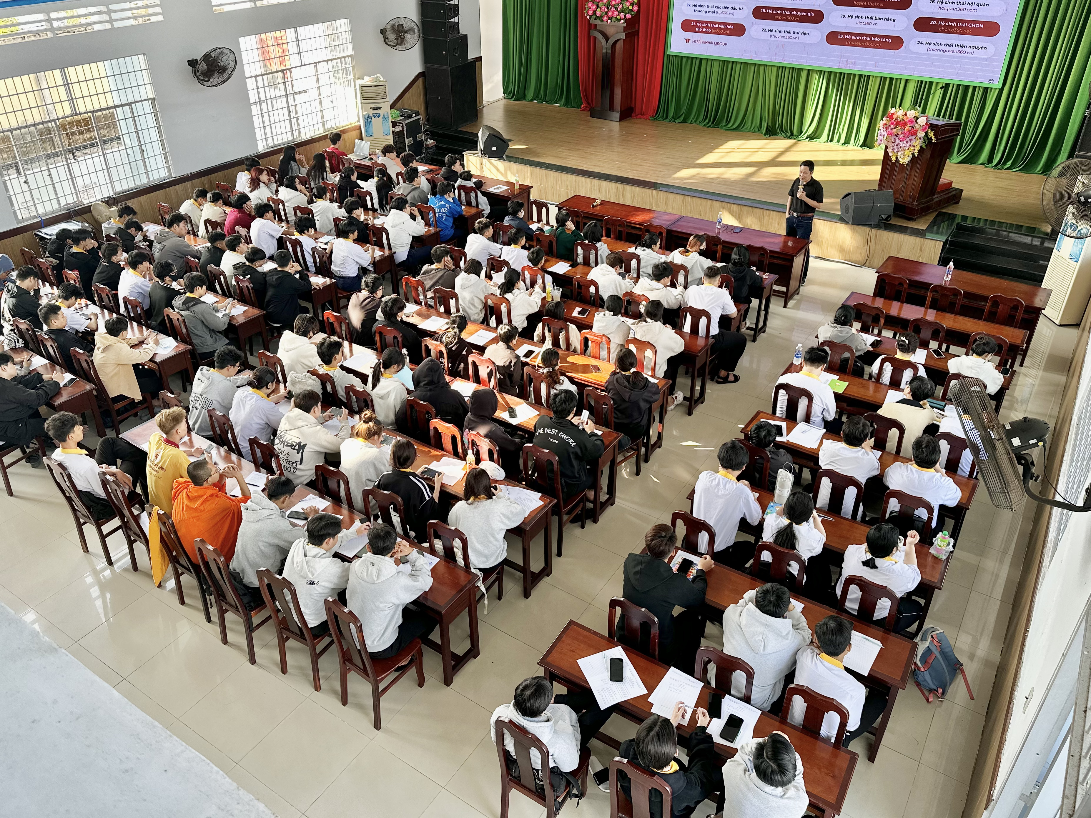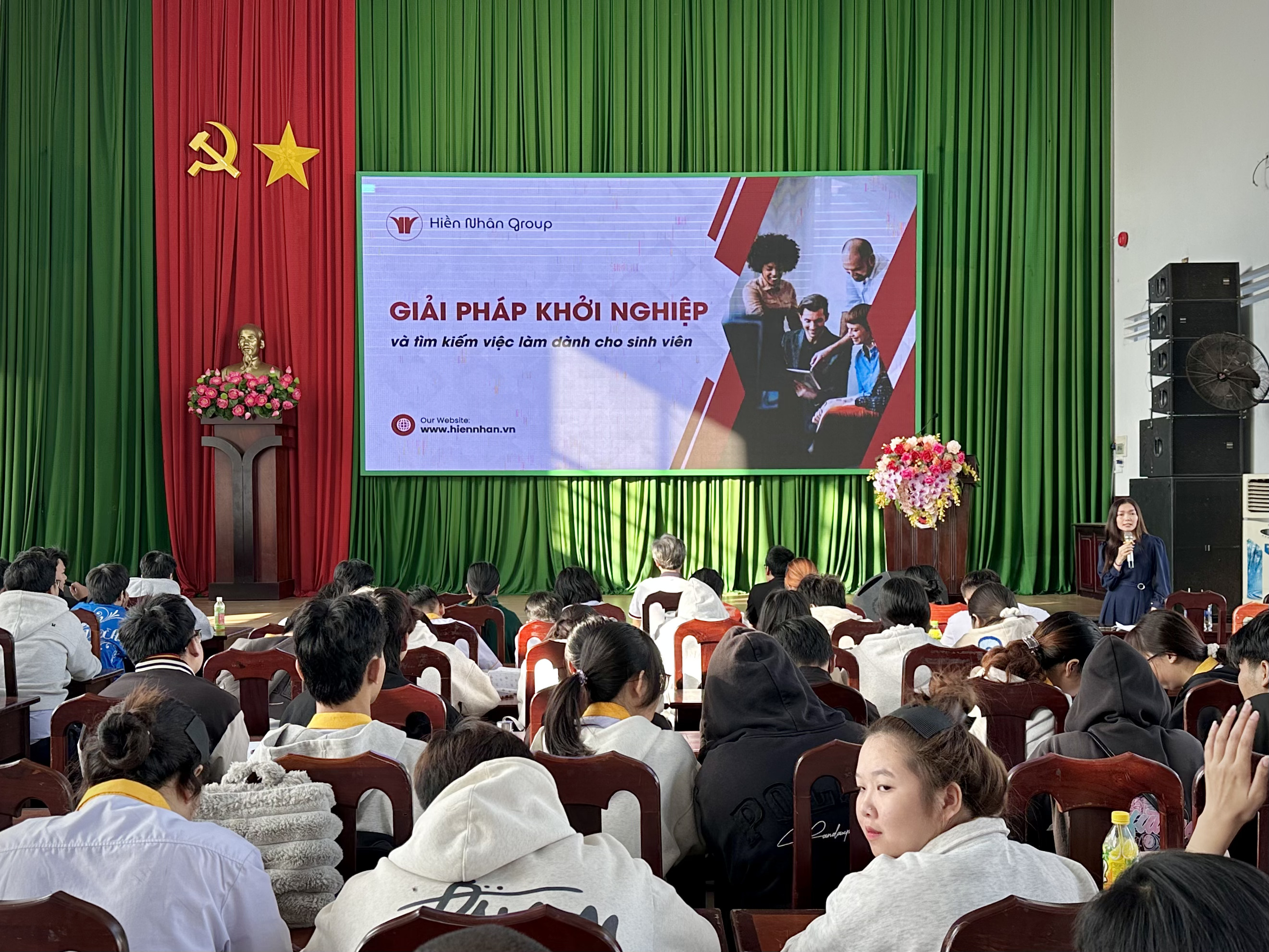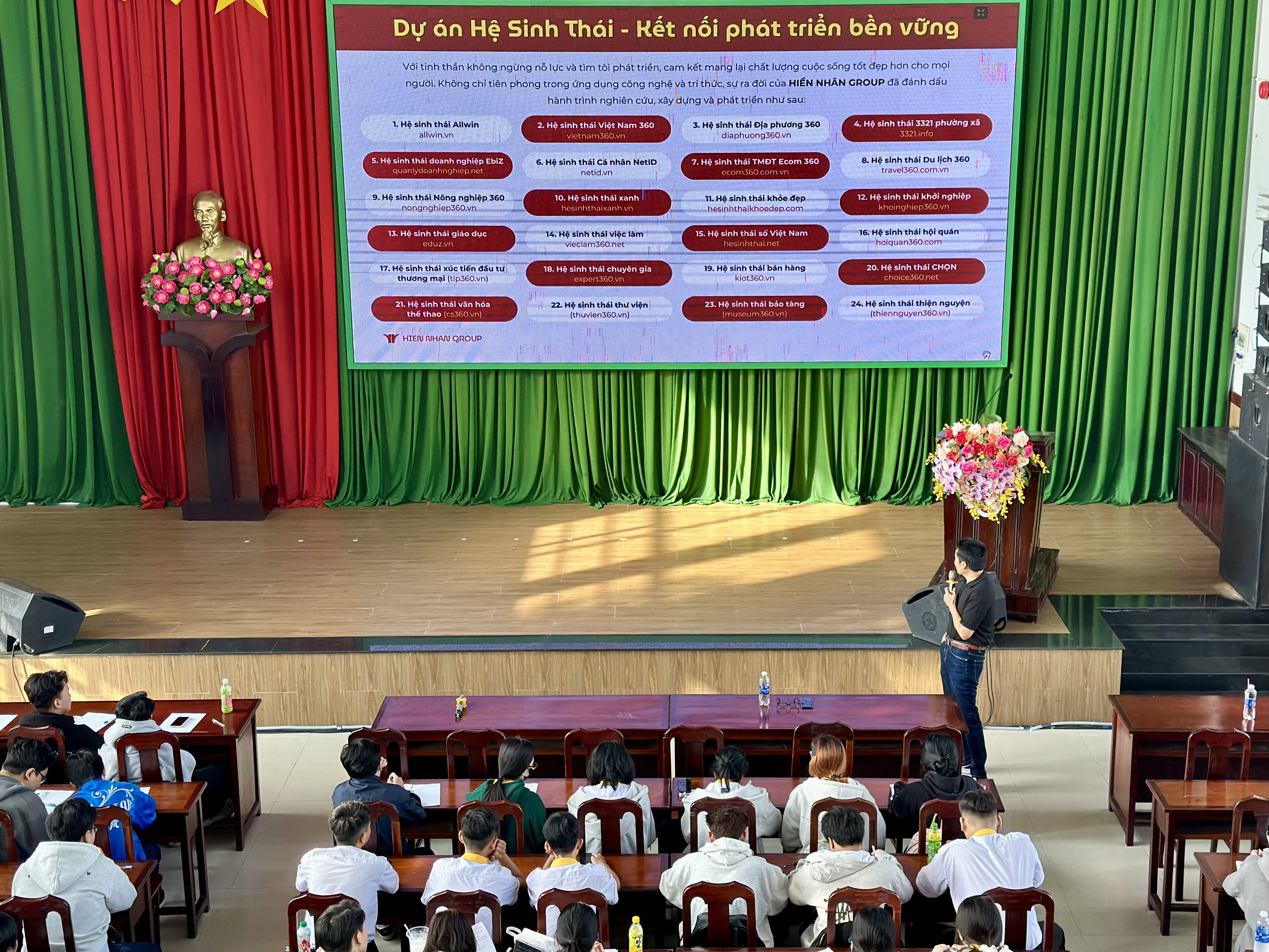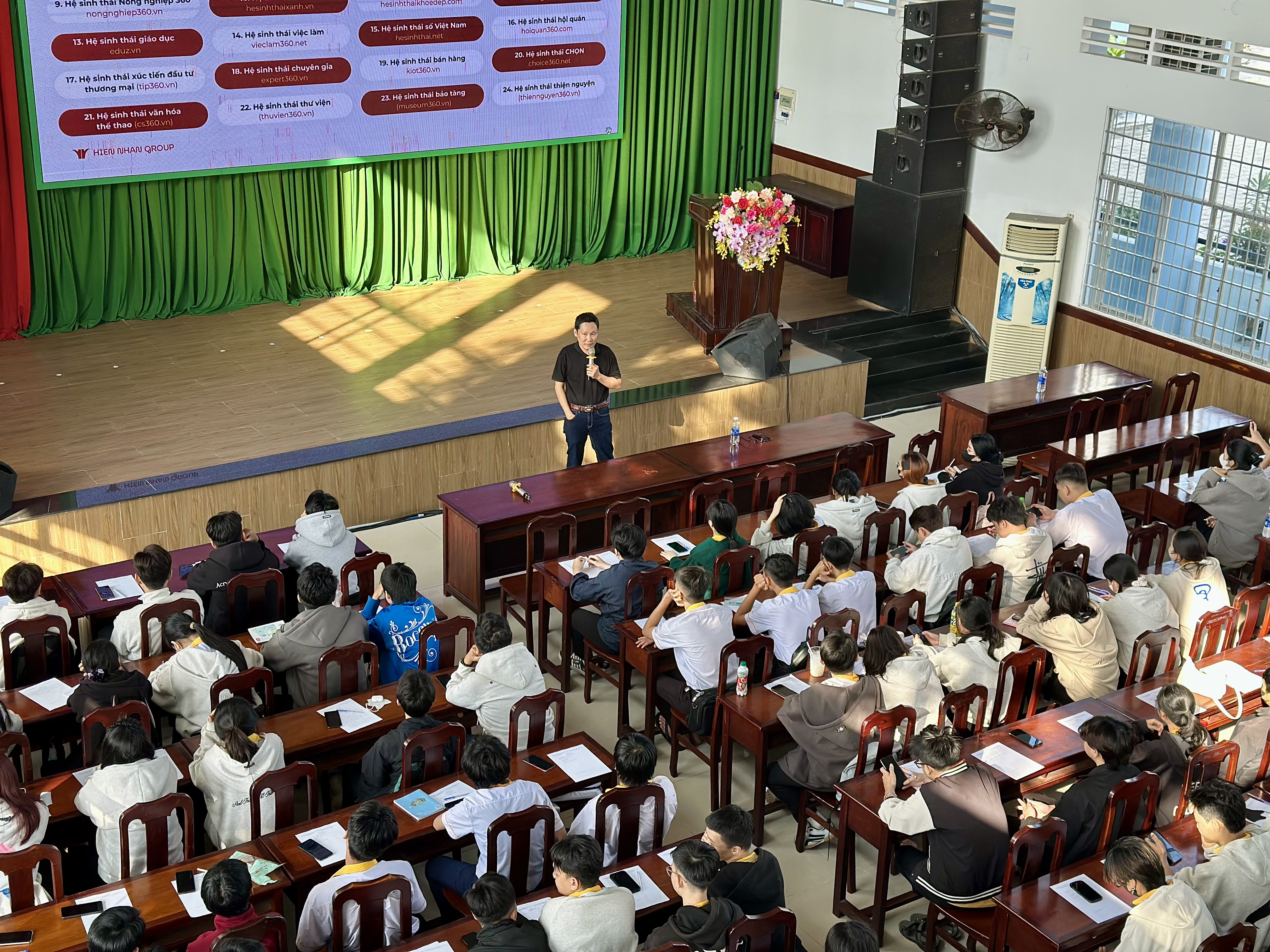 Tại buổi chia sẻ, diễn giả đã giới thiệu tổng quan về Hiền Nhân Group – doanh nghiệp hoạt động trong lĩnh vực công nghệ và chuyển đổi số với định hướng xây dựng các hệ sinh thái công nghệ quy mô lớn, phục vụ phát triển kinh tế, xã hội và hỗ trợ khởi nghiệp. Hiện nay, công ty đang triển khai 24 hệ sinh thái công nghệ trên toàn quốc, kết nối nhiều lĩnh vực như doanh nghiệp, địa phương, thương mại điện tử, du lịch, nông nghiệp, giáo dục, việc làm và AI với hàng triệu dữ liệu được tích hợp. Các hệ sinh thái này vừa là sản phẩm công nghệ vừa tạo môi trường thực hành thực tế để sinh viên tham gia, học hỏi và phát triển năng lực nghề nghiệp. Thực tế cho thấy, nhiều sinh viên cao đẳng đang trực tiếp làm việc trong các dự án của công ty, trong đó có những bạn đảm nhiệm vai trò quan trọng ở bộ phận công nghệ.