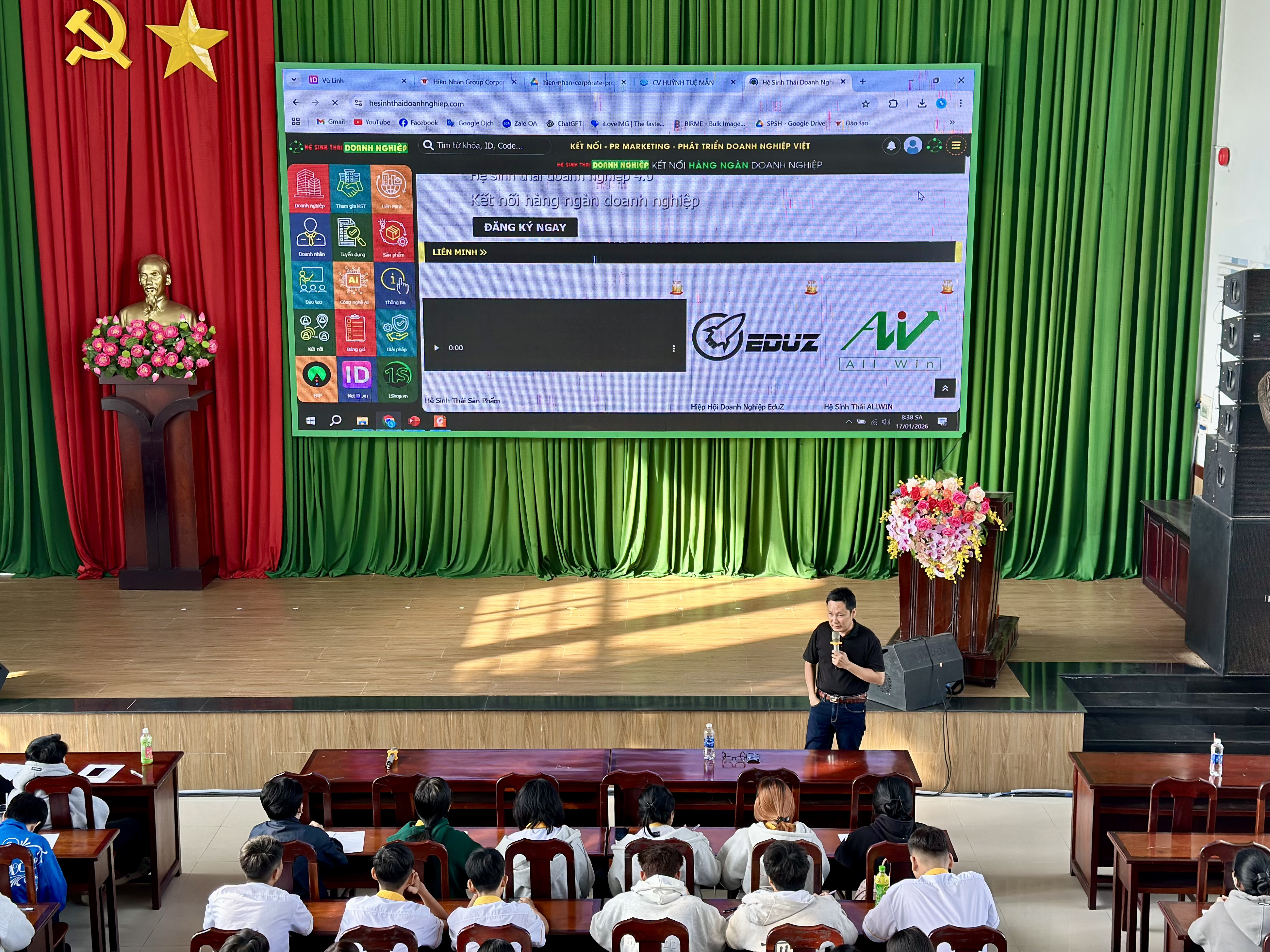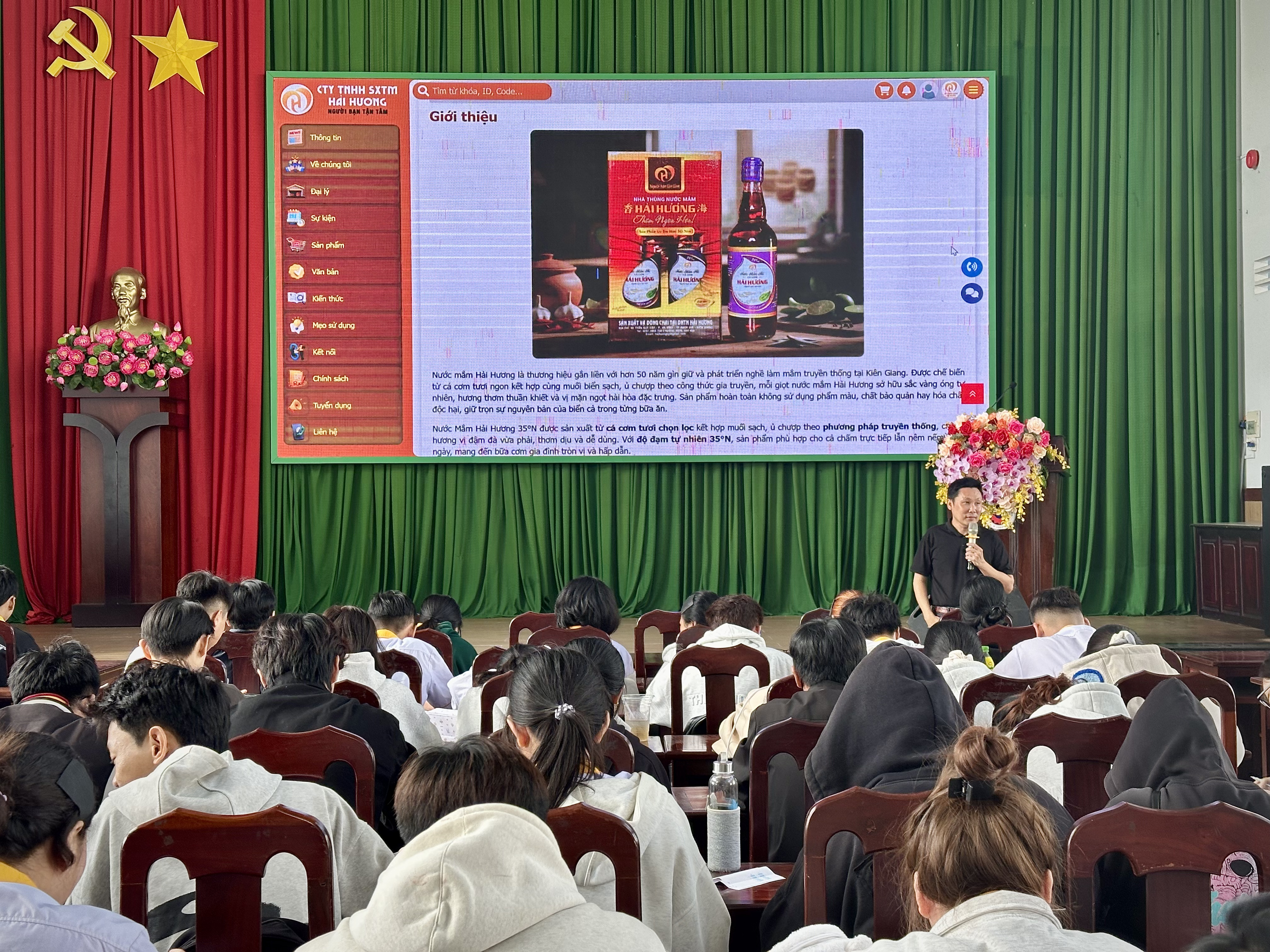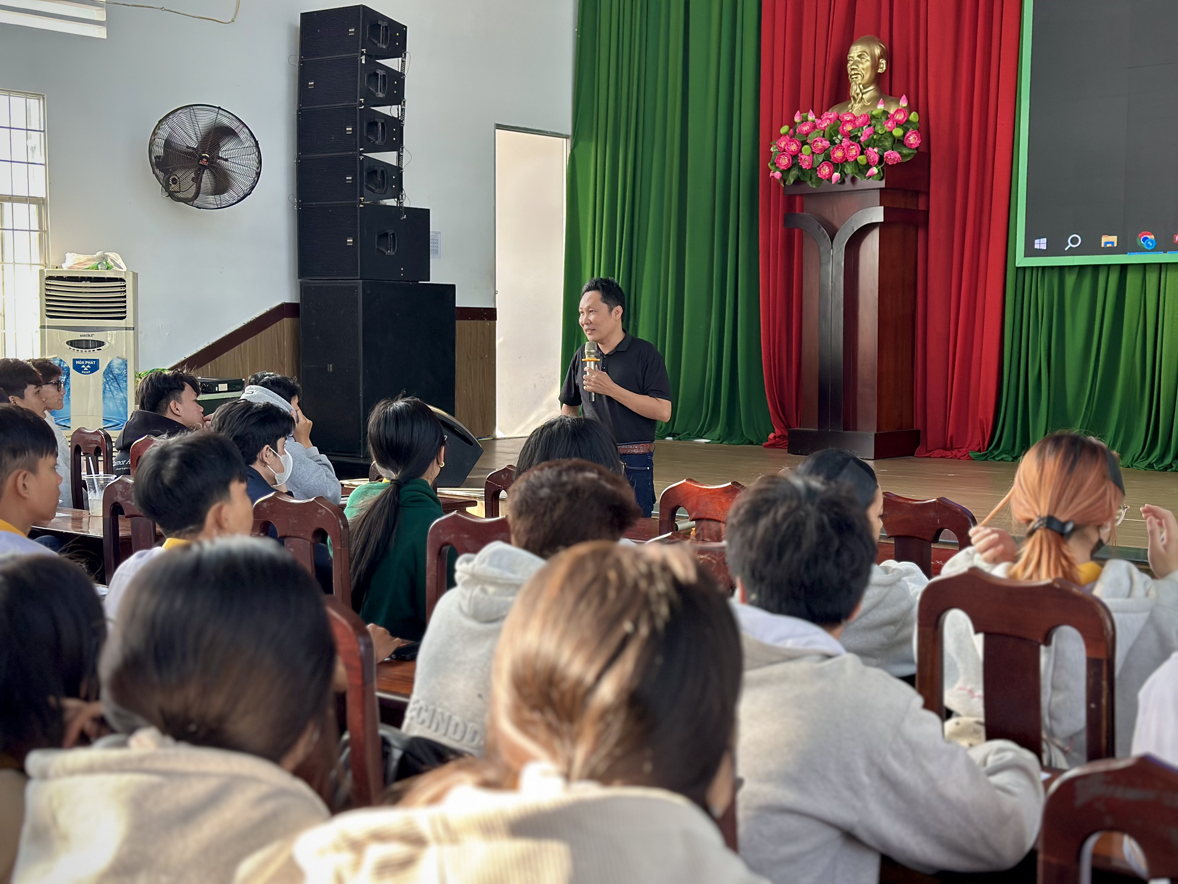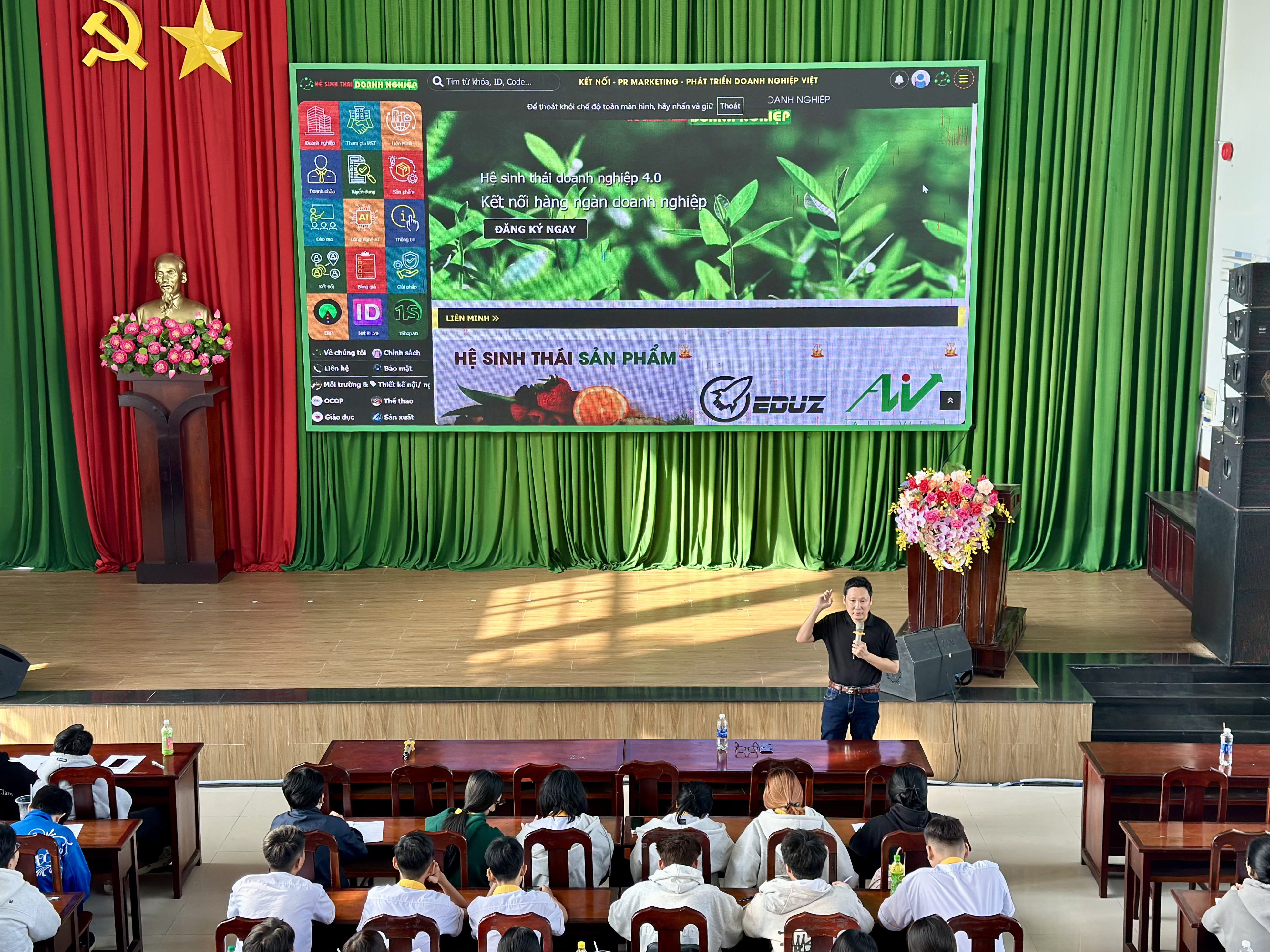 Tại buổi chia sẻ, diễn giả đã giới thiệu tổng quan về Hiền Nhân Group – doanh nghiệp hoạt động trong lĩnh vực công nghệ và chuyển đổi số với định hướng xây dựng các hệ sinh thái công nghệ quy mô lớn, phục vụ phát triển kinh tế, xã hội và hỗ trợ khởi nghiệp. Hiện nay, công ty đang triển khai 24 hệ sinh thái công nghệ trên toàn quốc, kết nối nhiều lĩnh vực như doanh nghiệp, địa phương, thương mại điện tử, du lịch, nông nghiệp, giáo dục, việc làm và AI với hàng triệu dữ liệu được tích hợp. Các hệ sinh thái này vừa là sản phẩm công nghệ vừa tạo môi trường thực hành thực tế để sinh viên tham gia, học hỏi và phát triển năng lực nghề nghiệp. Thực tế cho thấy, nhiều sinh viên cao đẳng đang trực tiếp làm việc trong các dự án của công ty, trong đó có những bạn đảm nhiệm vai trò quan trọng ở bộ phận công nghệ.