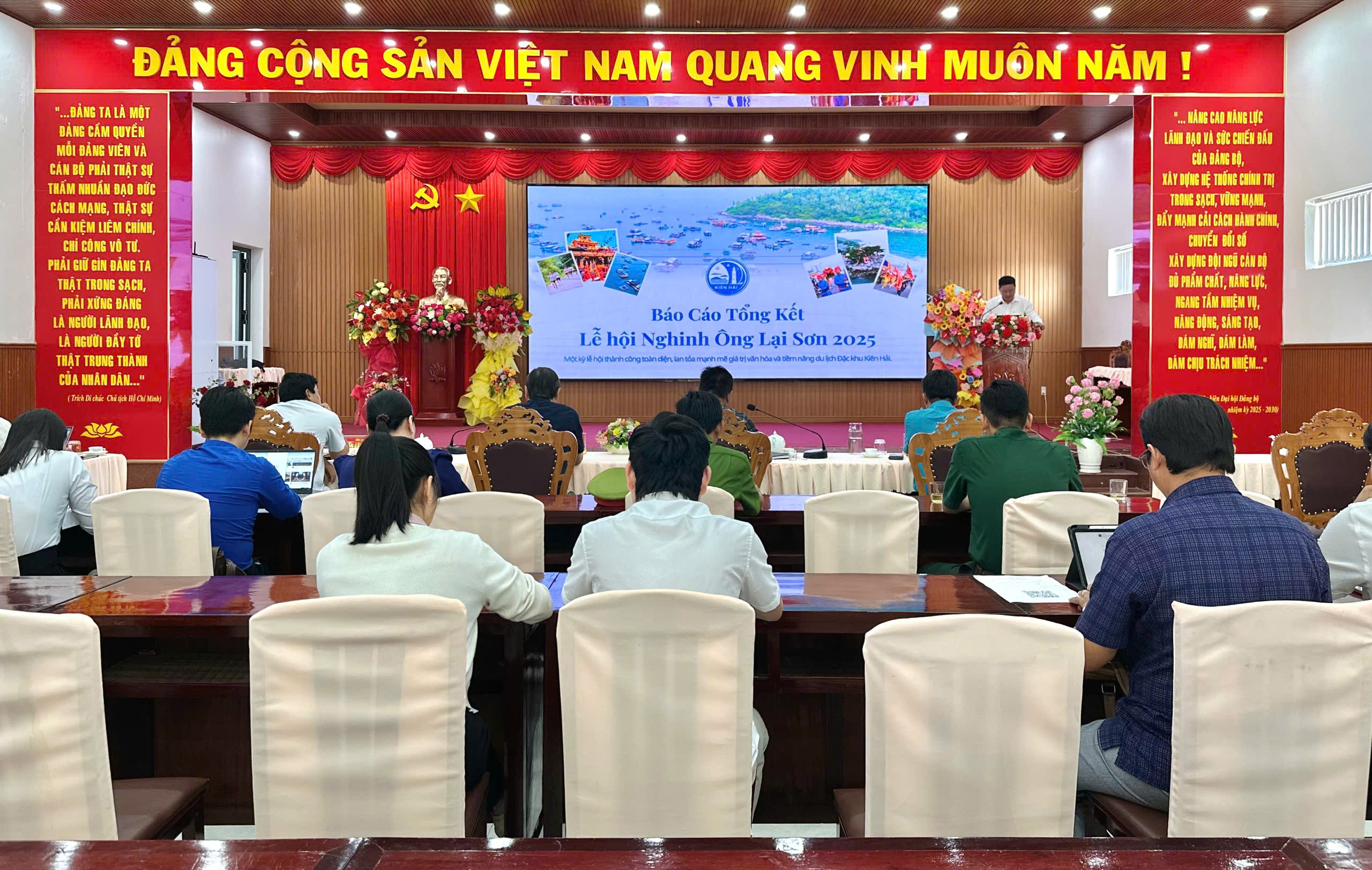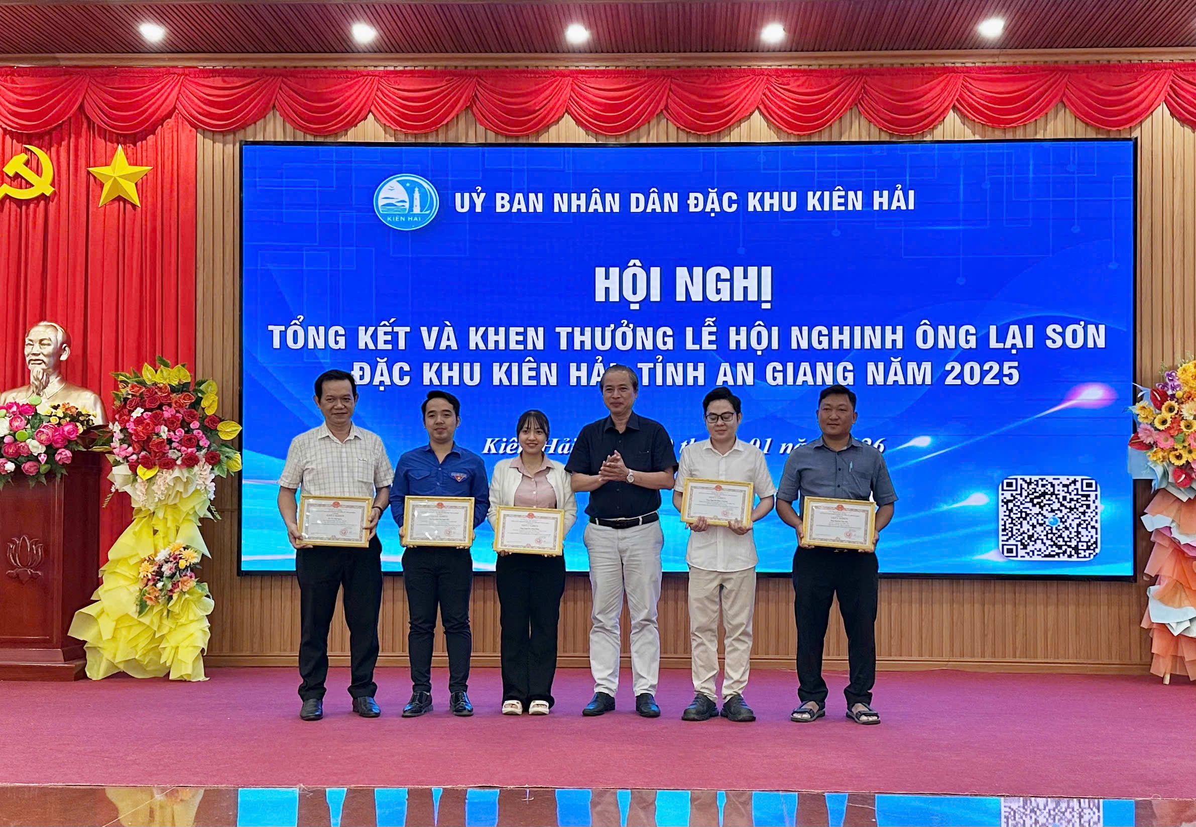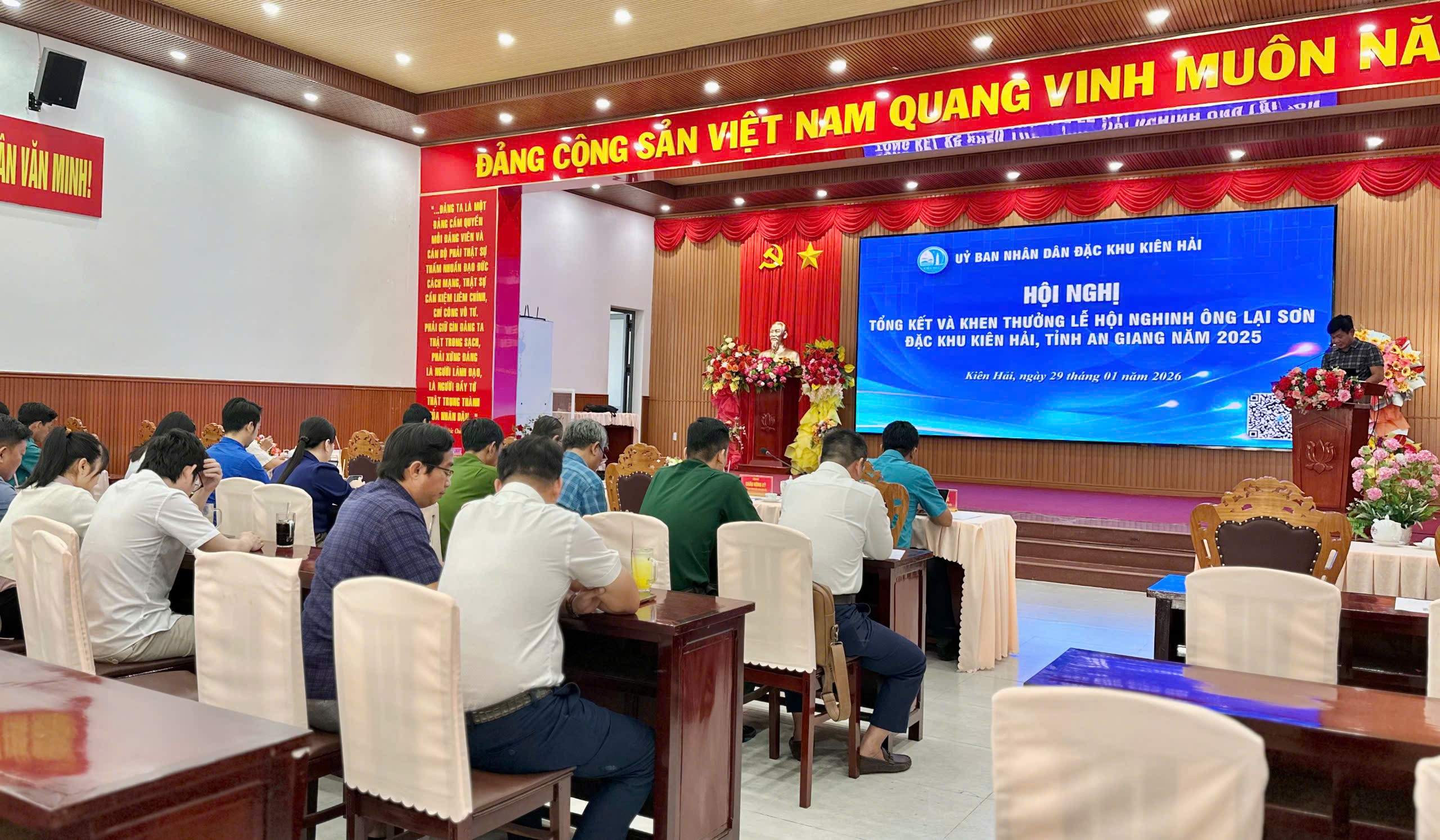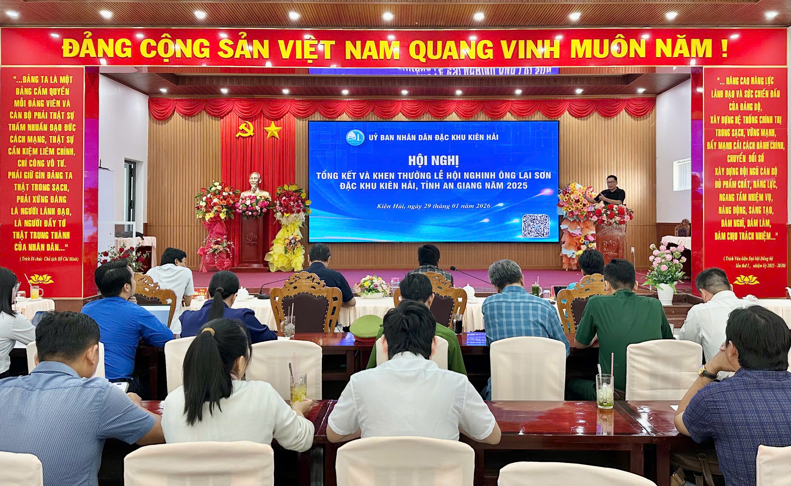 Hội nghị tổng kết và khen thưởng Lễ hội Nghinh Ông Lại Sơn năm 2025 được tổ chức vào chiều ngày 29/01/2026 tại Phòng họp Thường trực UBND đặc khu Kiên Hải, tỉnh An Giang. Hội nghị có sự tham dự của Thường trực Đảng ủy đặc khu, lãnh đạo UBND đặc khu, Ban Tổ chức lễ hội, đại diện các phòng, ban chuyên môn cùng các tập thể, cá nhân có thành tích tiêu biểu. Đây là dịp để nhìn lại, đánh giá toàn diện kết quả công tác tổ chức Lễ hội Nghinh Ông năm 2025, đồng thời ghi nhận những đóng góp nổi bật và định hướng nâng cao chất lượng tổ chức cho các kỳ lễ hội trong thời gian tới.