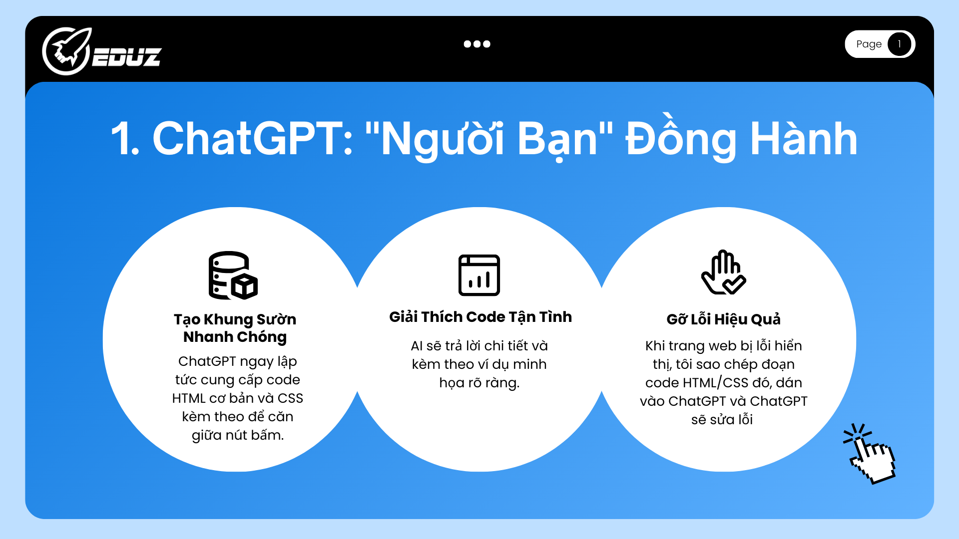 Hành trình trở thành một Front-end Developer là một cuộc phiêu lưu thú vị, và ChatGPT là chiếc la bàn hiện đại giúp tôi đi đúng hướng. Từ việc tạo ra trang HTML/CSS đầu tiên đầy vụng về, đến việc tùy chỉnh các thành phần phức tạp hơn, AI đã giúp tôi tiết kiệm thời gian và nâng cao sự tự tin.