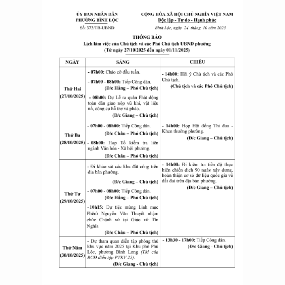 Lịch Làm Việc Của Chủ Tịch Và Các Phó Chủ Tịch UBND Phường Tỉnh Đồng Nai, Từ Ngày 27/10/2025 Đến Ngày 01/11/2025