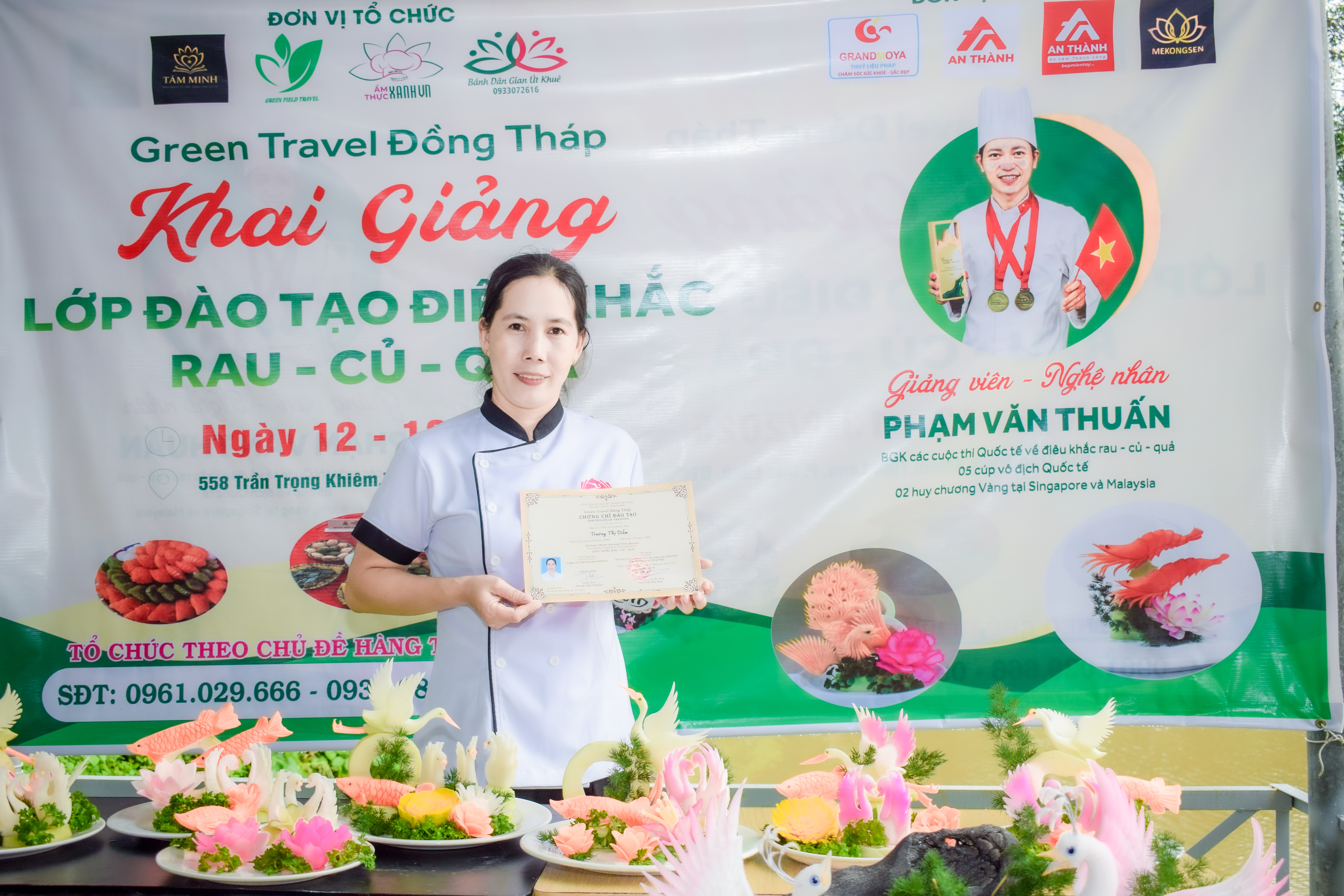 Chiều ngày 13/09, tại Khu Du lịch Vườn dừa Út Khuê - 558 Trần Trọng Khiêm, Tịnh Long, Phường Cao Lãnh, Đồng Tháp, buổi bế giảng lớp đào tạo Điêu khắc Rau – Củ – Quả do Green Travel Đồng Tháp tổ chức đã diễn ra trong bầu không khí ấm áp, đầy tự hào. Sau 4 buổi học ngắn ngủi, nhưng trọn vẹn sự hăng say và nỗ lực, toàn bộ học viên đều gặt hái được thành quả ngọt ngào.