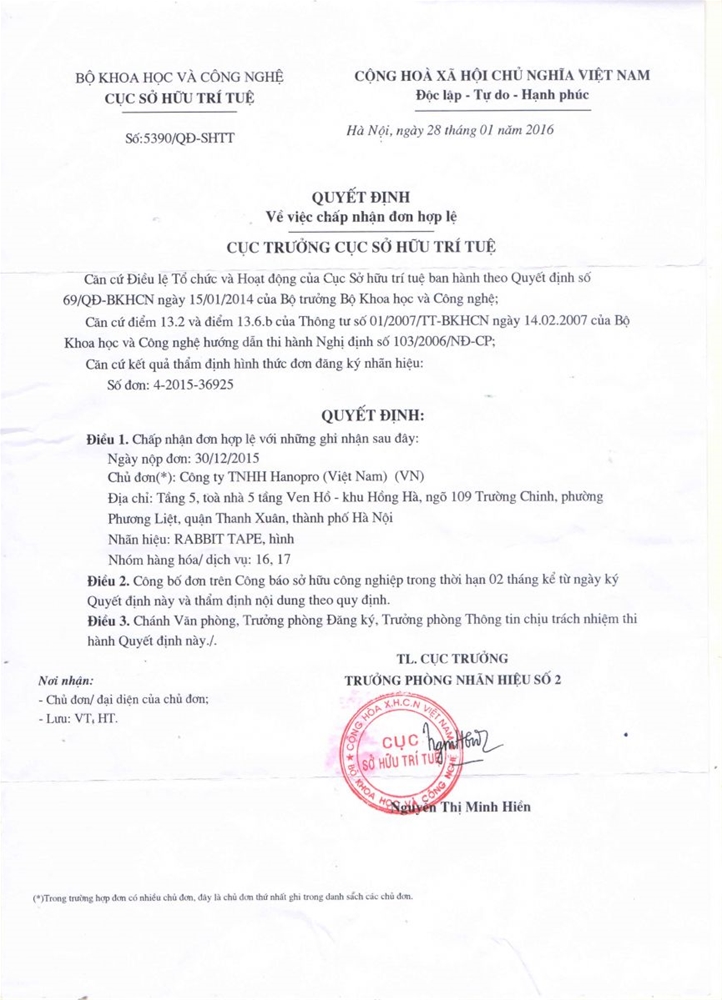 Căn cứ Điều lệ Tổ chức và Hoạt động của Cục Sở hữu trí tuệ ban hành theo Quyết định số 60/QĐ-BKHCN ngày 15/01/2014 của Bộ trưởng Bộ Khoa học và Công nghệ. Căn cứ điểm 13.2 và điểm 13.6.b của Thông tư số 01/2007/TT-BKHCN ngày 14/02/2007 của Bộ Khoa học và Công nghệ về đăng ký nhãn hiệu cho số đơn: 4-2015-36925 về việc quyết định chấp nhận đơn đăng ký nhãn hiệu băng dính rabbit tape và mickey tape.