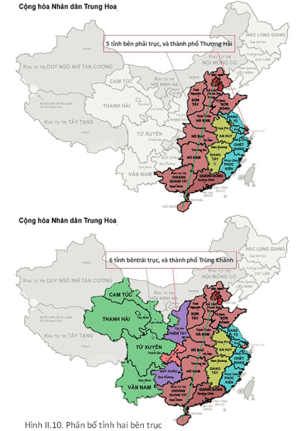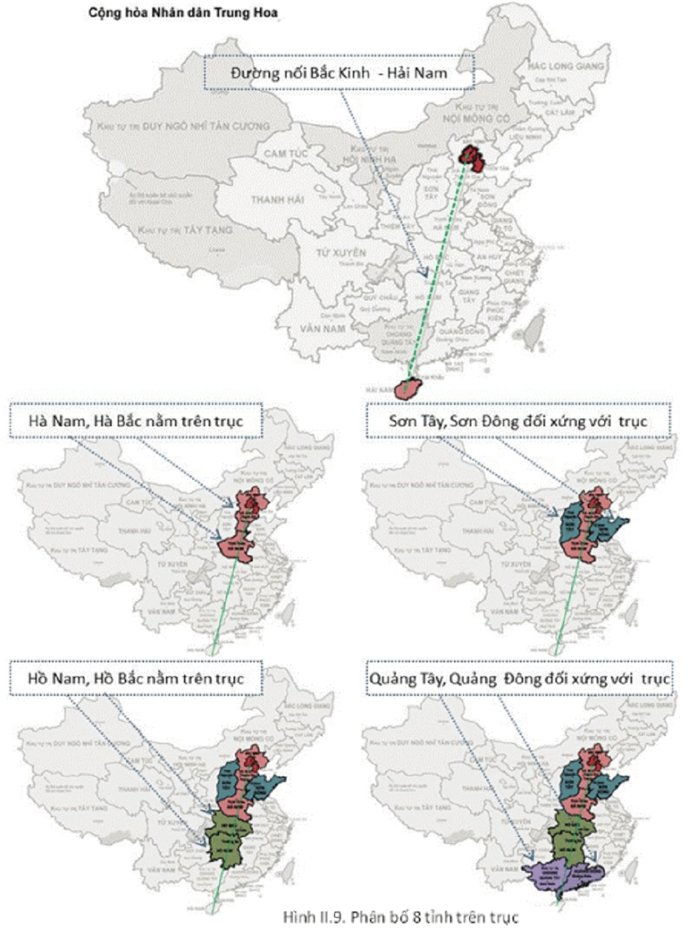 Với Trung Quốc, sử dụng hệ quy chiếu hình học, hãy tưởng tượng có một đường thẳng từ Bắc Kinh nối với điểm giữa đảo Hải Nam. Phân bố 8 tỉnh theo trục này bắt đầu là tỉnh Hà Bắc, Hà Nam nằm trên trục, Sơn Đông, Sơn Tây đối xứng với trục. Kế tiếp trên trục là Hồ Bắc, Hồ Nam; Quảng Đông, Quảng Tây nằm đối xứng với trục. (hình II.9)