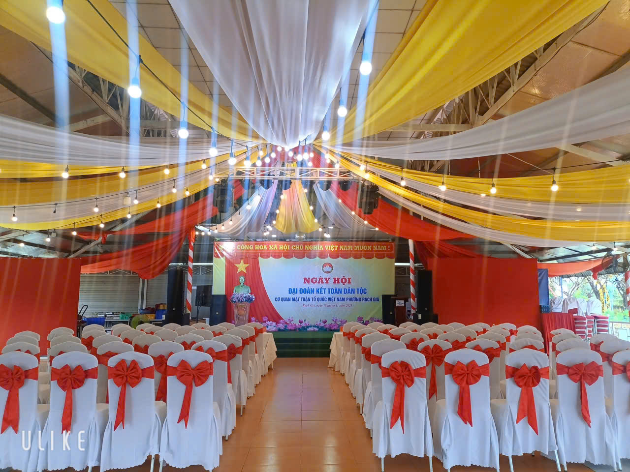 - Hội trường sang trọng, linh hoạt: Khu vực tổ chức được trang trí lộng lẫy với dải lụa vàng, đỏ rực rỡ trên trần, cùng hệ thống ánh sáng ấm áp, tạo nên một không gian trang trọng nhưng không kém phần gần gũi, đúng với tinh thần "Đại Đoàn Kết".