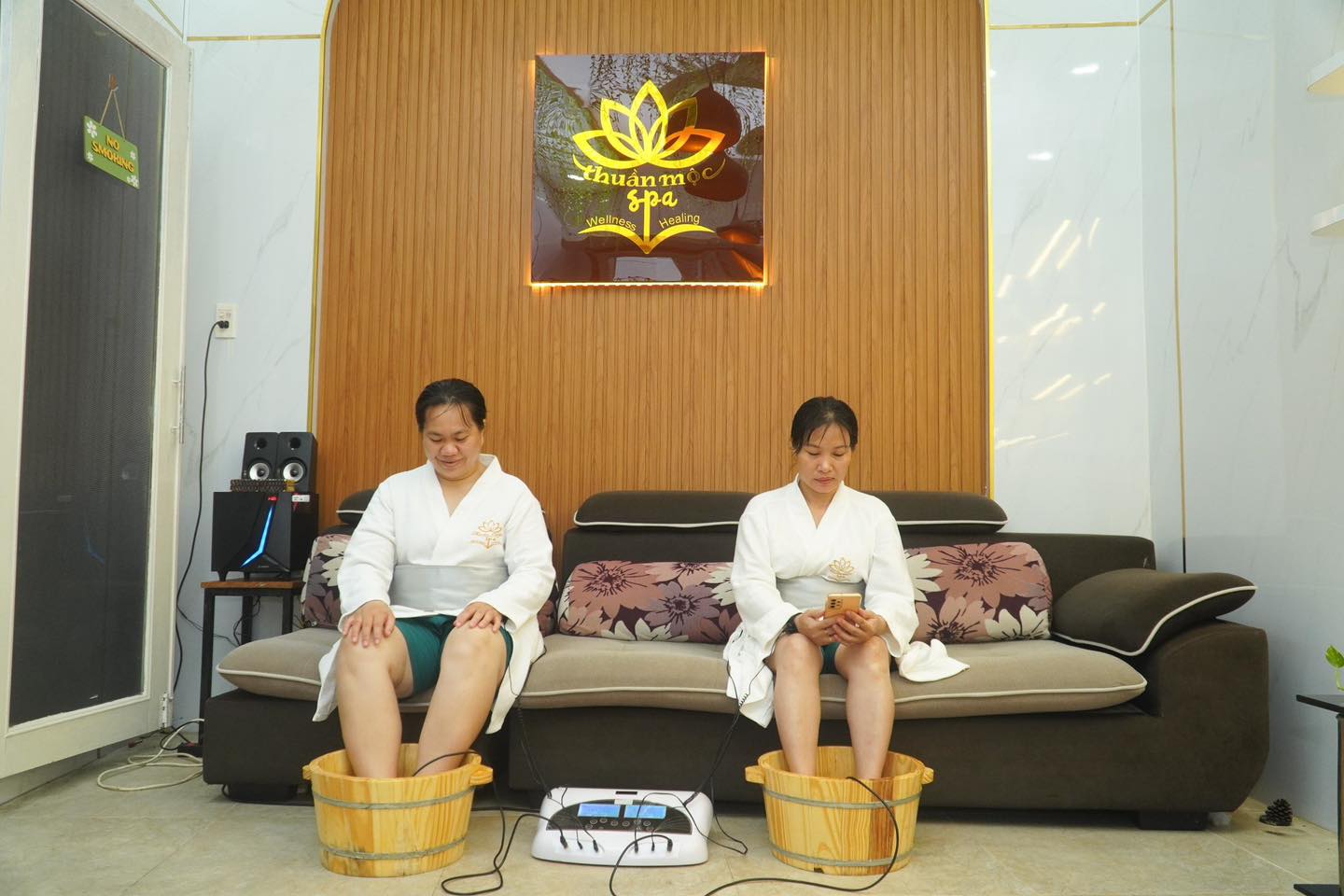 Sau đó, bạn có thể được yêu cầu tháo giày và vớ và ngồi thoải mái trên ghế ngả hoặc trên bàn massage.