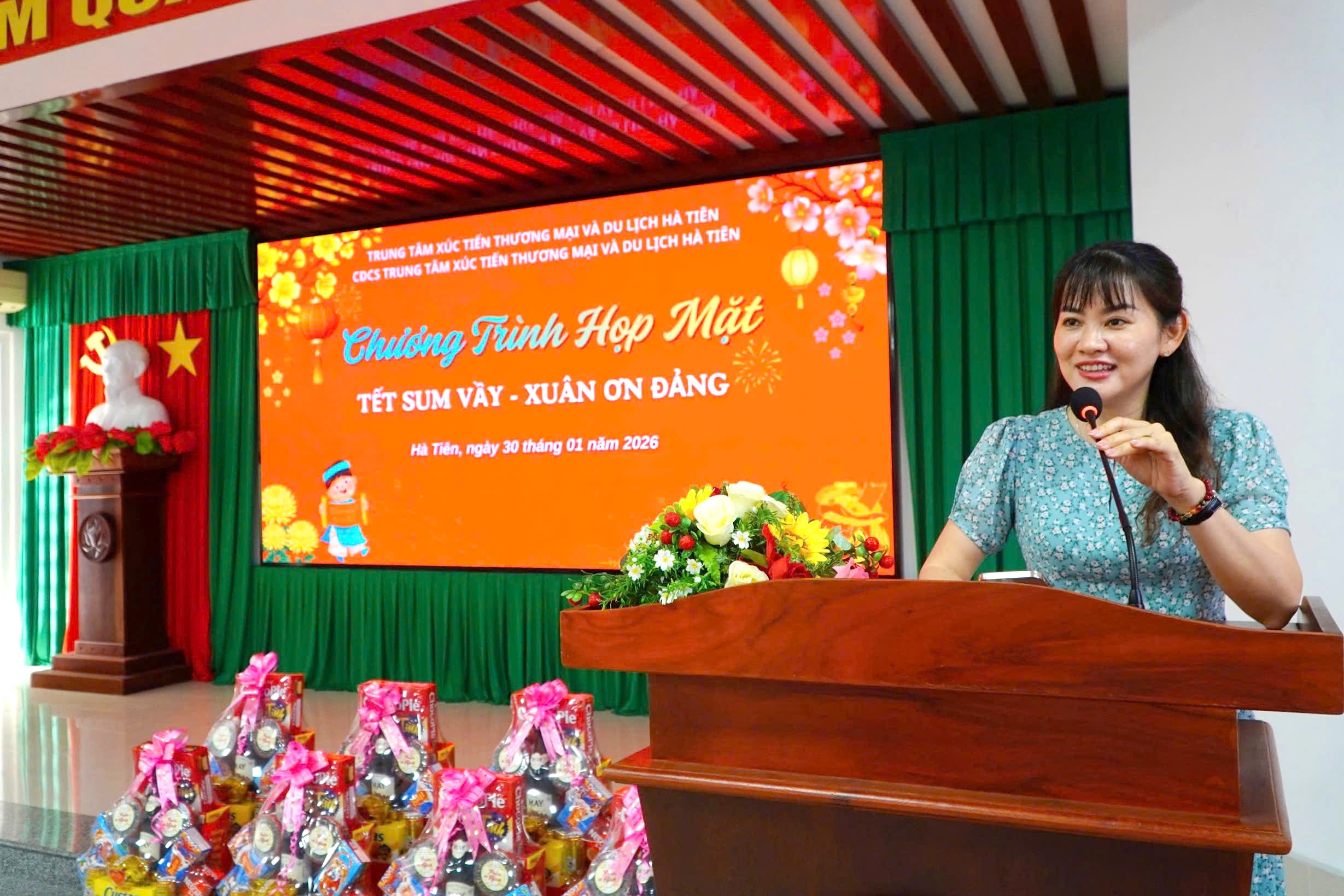 Phát biểu tại buổi họp mặt, bà Nguyễn Thị Mộng Quyên - Giám đốc Trung tâm Xúc tiến Thương mại và Du lịch Hà Tiên nhấn mạnh: “Tết Sum vầy” là hoạt động được duy trì trong nhiều năm qua, thể hiện truyền thống đoàn kết, tương thân tương ái, cũng như sự quan tâm sâu sắc của Ban Giám đốc và Công đoàn cơ sở đối với đời sống của viên chức, người lao động.