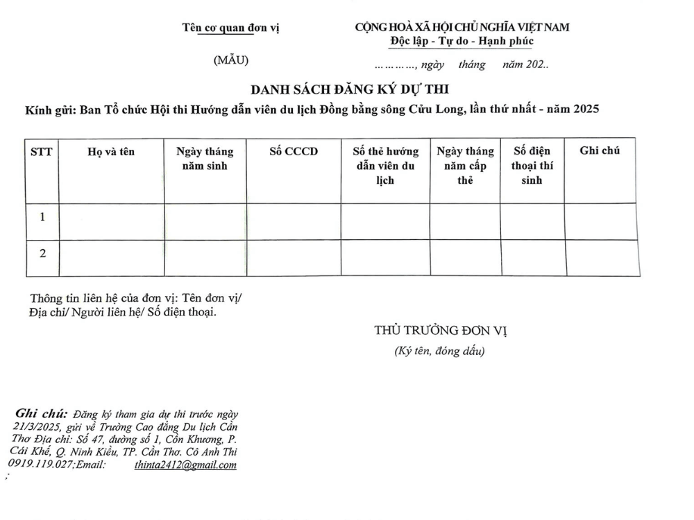 Phiếu Đăng Ký Thể Lệ Qui Chế Hôi Thi HDV Du Lịch ĐBSCL 2025 Lân I