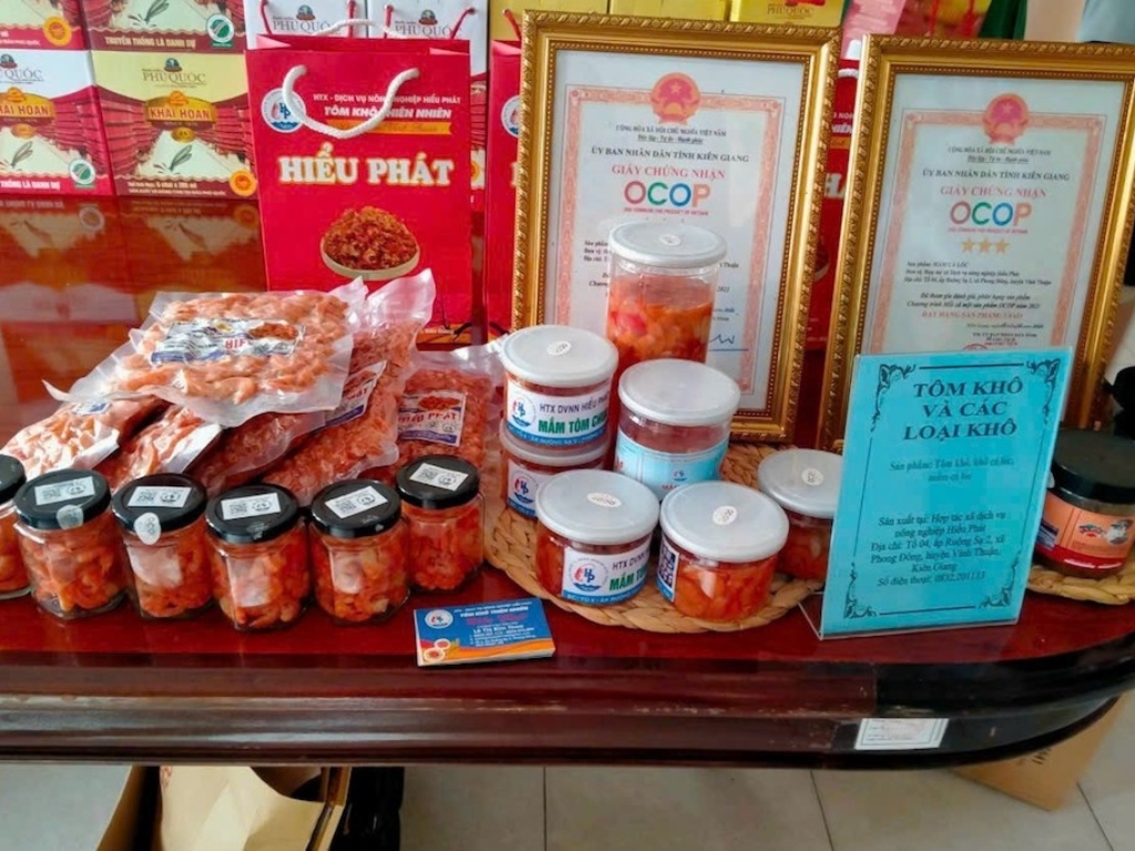 Tận dụng lợi thế vùng nguyên liệu dồi dào, HTX đã xây dựng chuỗi chế biến khép kín từ tôm tươi, cho ra đời nhiều sản phẩm đặc sản đạt chứng nhận sản phẩm OCOP cấp tỉnh như:- Tôm khô