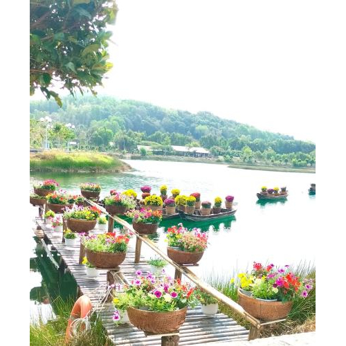 Dưới chân núi có hồ nước trong xanh, tạo nên một khung cảnh sơn thủy hữu tình. Hồ nước là nơi du khách có thể thư giãn, tận hưởng không khí trong lành. Hồ có diện tích khoảng 20m2 và chu vi khoảng 720 mét, có một sàn tre ra hồ rộng rãi và thoải mái để du khách tự do chụp hình với mặt hồ trong xanh, phản chiếu bóng núi và cây cối xung quanh, tạo nên một bức tranh thiên nhiên tuyệt đẹp. Du khách có thể tản bộ quanh thảm cỏ xanh mướt các hàng cây dương, phượng vĩ, hồng lộc và nhìn ngắm các loài hoa đang khoe sắc thắm bốn mùa trong năm.