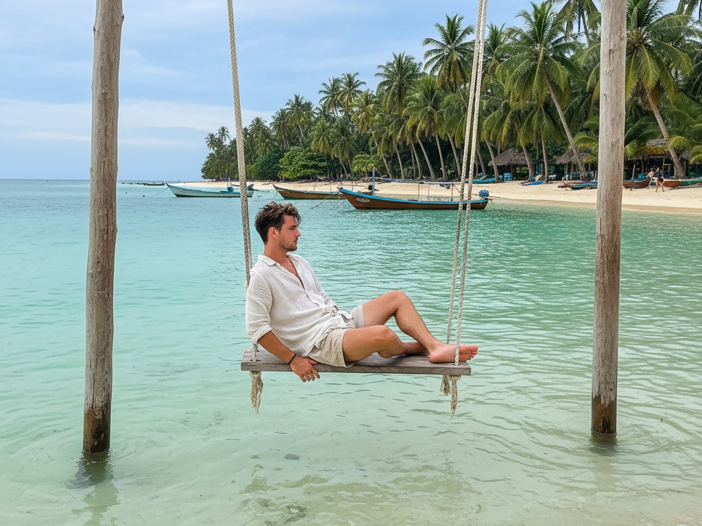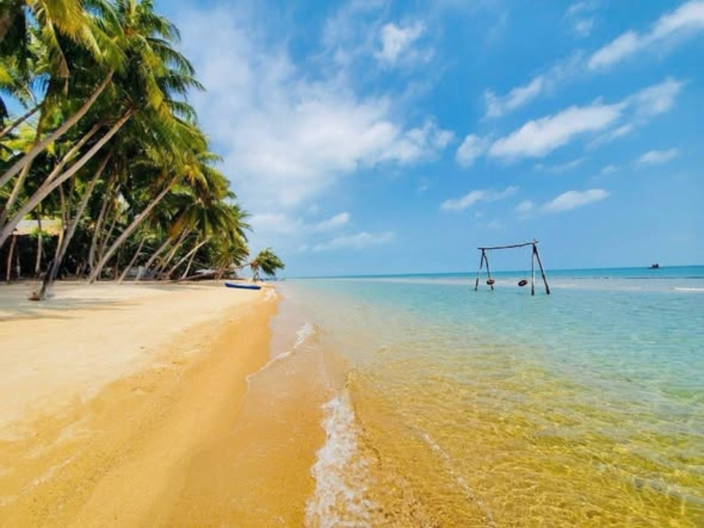 Nằm giữa biển trời Lại Sơn, Đặc khu Kiên Hải, An Giang, Bãi tắm Bãi Bàng Hòn Sơn (Bãi Bàng) sở hữu khung cảnh tự nhiên hài hòa với bờ cát trải dài, hàng dừa nghiêng soi bóng và mặt biển xanh ngọc trong vắt.
