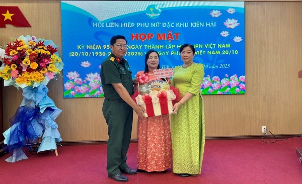 Nhân dịp này Ban chỉ huy phòng thủ Khu vực 4, đặc khu Phú Quốc trao lẵng hoa chúc mừng đến Hội Liên hiệp Phụ nữ đặc khu Kiên Hải.