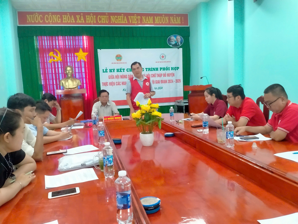 Ông Lê Ngọc Minh, Huyện ủy viên, Chủ tịch Hội Nông dân huyện và ông Nguyễn Hữu Hạnh, Chủ tịch Hội Chữ thập đỏ huyện thống nhất ký kết Chương trình phối hợp thực hiện hoạt động nhân đạo thiện nguyện và an sinh xã hội, giai đoạn 2024-2029.