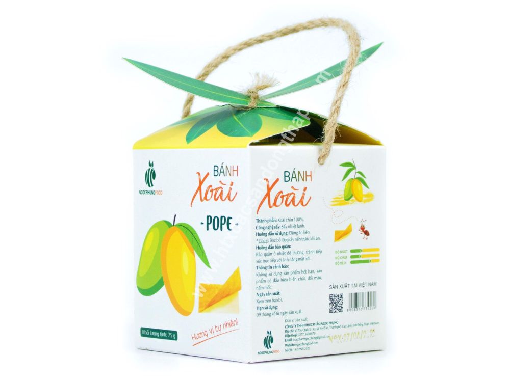 Bánh Xoài sấy dẻo được làm từ Xoài Cát chu – một loại trái cây đặc sản của Đồng Tháp được áp dụng công nghệ sấy lạnh, kỹ thuật sấy tiên tiến. Bánh Xoài có hương vị chua ngọt của xoài, hương vị xoài cô đọng lại làm cho miếng xoài trở nên đậm vị hơn. Màu bánh vàng sáng thu hút mọi ánh nhìn, miếng xoài dẻo dai lý tưởng.