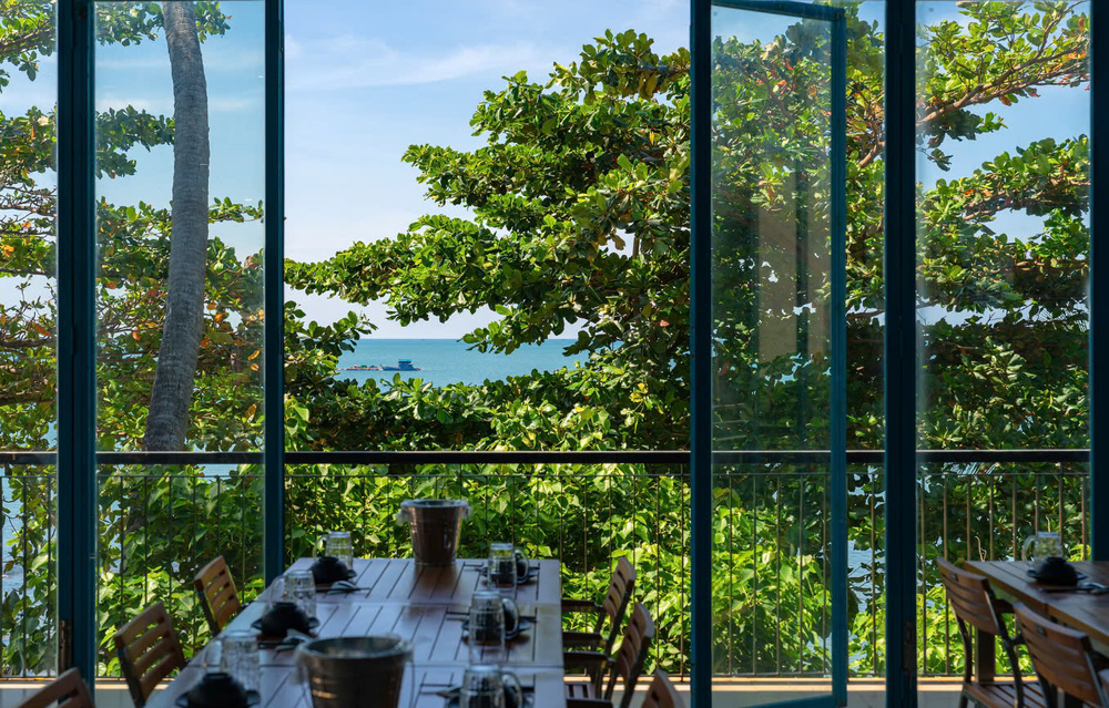 Không gian được chia thành khu ngoài trời sát bãi cát và phòng máy lạnh rộng rãi, kèm bể hải sản lớn để khách tự tay chọn nguyên liệu. Bếp mở luôn “khoe” sự sạch sẽ, dịch vụ thân thiện có sẵn ghế cho trẻ em, giúp bữa ăn trở nên vừa sang trọng vừa gần gũi giữa khung cảnh biển xanh và gió mát.