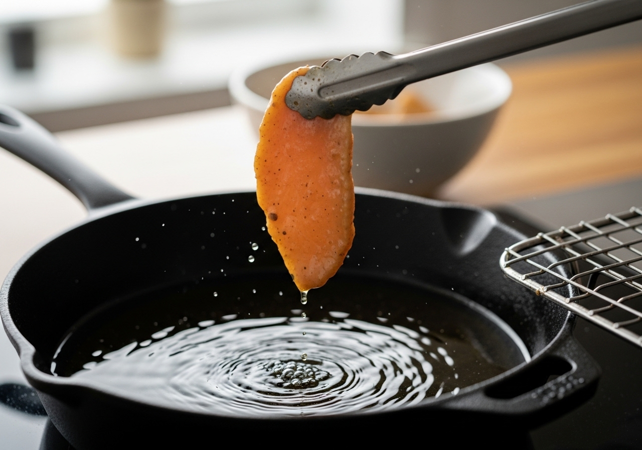 Một lỗi nhỏ nhưng rất quan trọng – nếu dầu chưa đủ nóng, thực phẩm sẽ hút dầu ngược và làm dầu bắn. Hãy đợi dầu đạt nhiệt độ ổn định, thử bằng đũa tre như trên, rồi mới cho từng miếng vào chảo nhẹ nhàng. Đừng thả cùng lúc quá nhiều, vì sẽ làm giảm nhiệt độ dầu đột ngột và khiến món ăn không giòn.