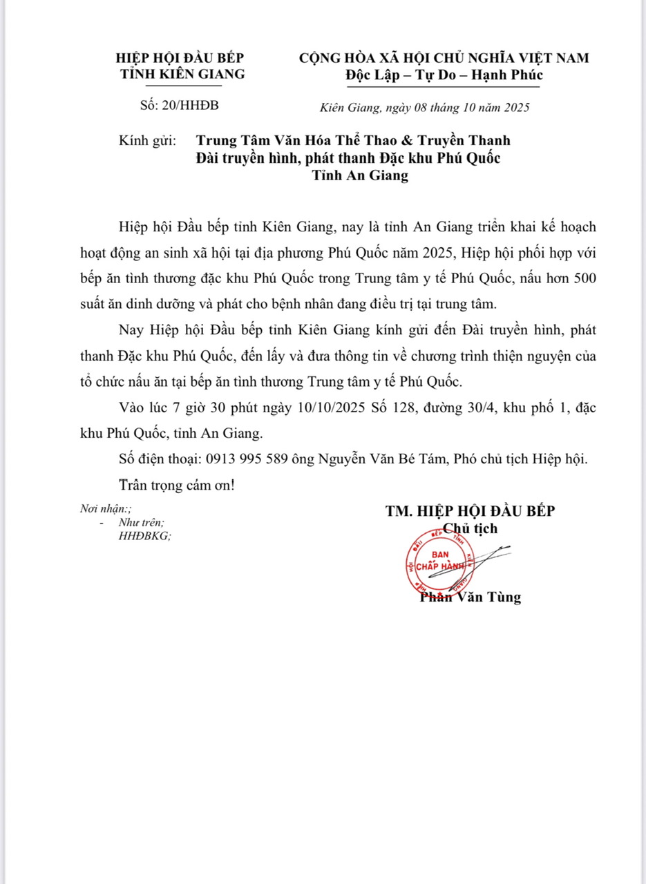 Với tinh thần tương thân tương ái, Hiệp hội Đầu bếp tỉnh Kiên Giang tiếp tục hành trình sẻ chia yêu thương, mang hơi ấm đến cộng đồng thông qua những hoạt động thiện nguyện ý nghĩa tại Phú Quốc.