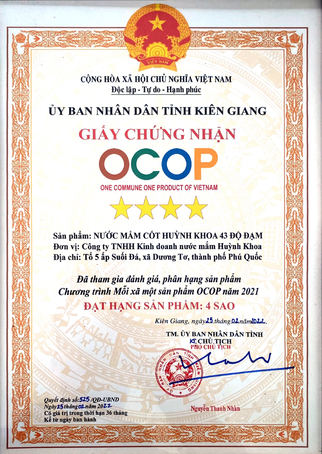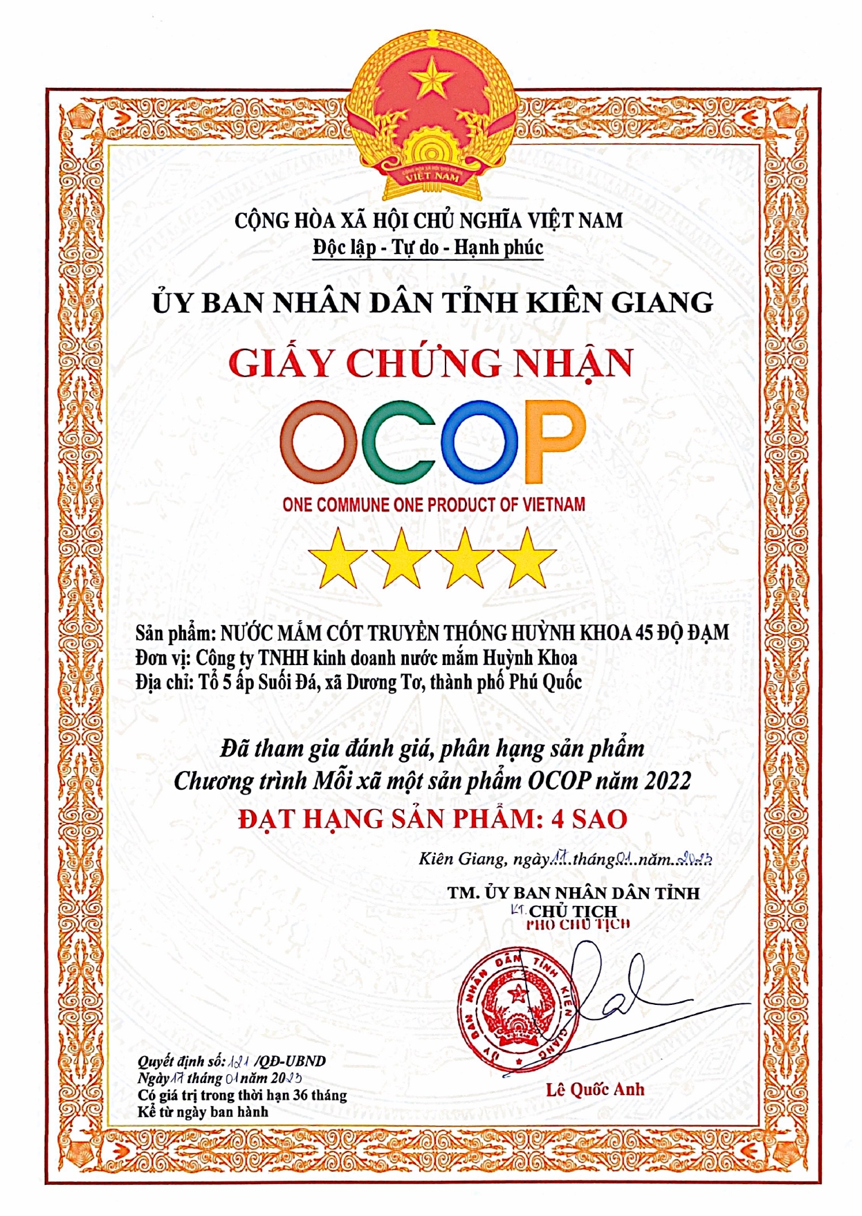 Với hơn 40 năm bền bỉ gìn giữ và phát triển hương vị nước mắm truyền thống, tập thể Nhà thùng Nước mắm Truyền thống Huỳnh Khoa Phú Quốc chính thức đón nhận Chứng nhận OCOP 5 sao cấp quốc gia cho các dòng sản phẩm nước mắm độ đạm cao: 40 – 43 – 45 độ đạm.