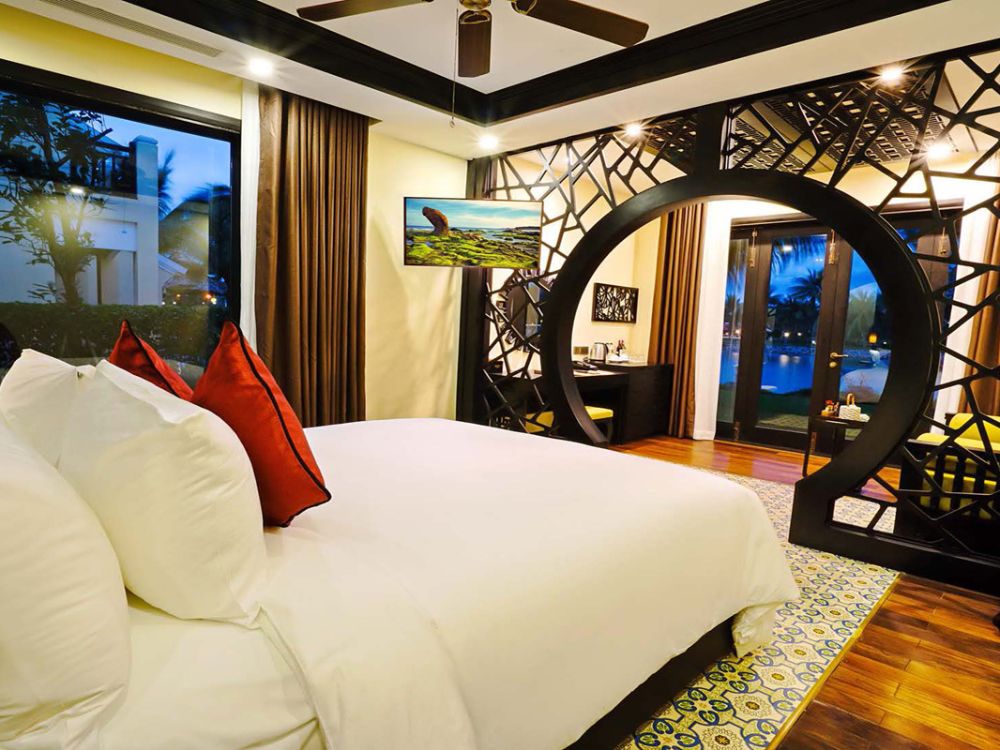 - Phòng Bungalow hướng hồ: nằm ngay giữa lòng khu nghỉ dưỡng, bungalow hướng ven sông với 4 phòng ngủ được thiết kế dành cho các gia đình hoặc nhóm bạn muốn ở gần nhau. Với ban công riêng, căn bungalow này cho phép bạn nhìn ra con kênh tự nhiên được bồi đắp bỡi dòng sông Đế Võng. Đây sẽ là sự lựa chọn lý tưởng cho kì nghỉ dưỡng sắp tới của bạn.