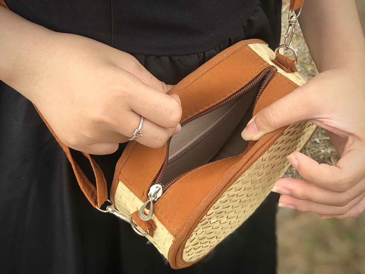 Túi lá buông hình trống được làm thủ công từ lá buông tự nhiên và các phụ liệu và được đan thủ công bởi những nghệ nhân lành nghề. Từng chi tiết của túi thể hiện sự tỉ mỉ, tinh tế và tâm huyết trong từng đường đan. Thiết kế có dây kéo tiện lợi, giúp bạn cất giữ đồ đạc an toàn – là lựa chọn hoàn hảo cho phong cách sống xanh và yêu vẻ đẹp thủ công truyền thống.
