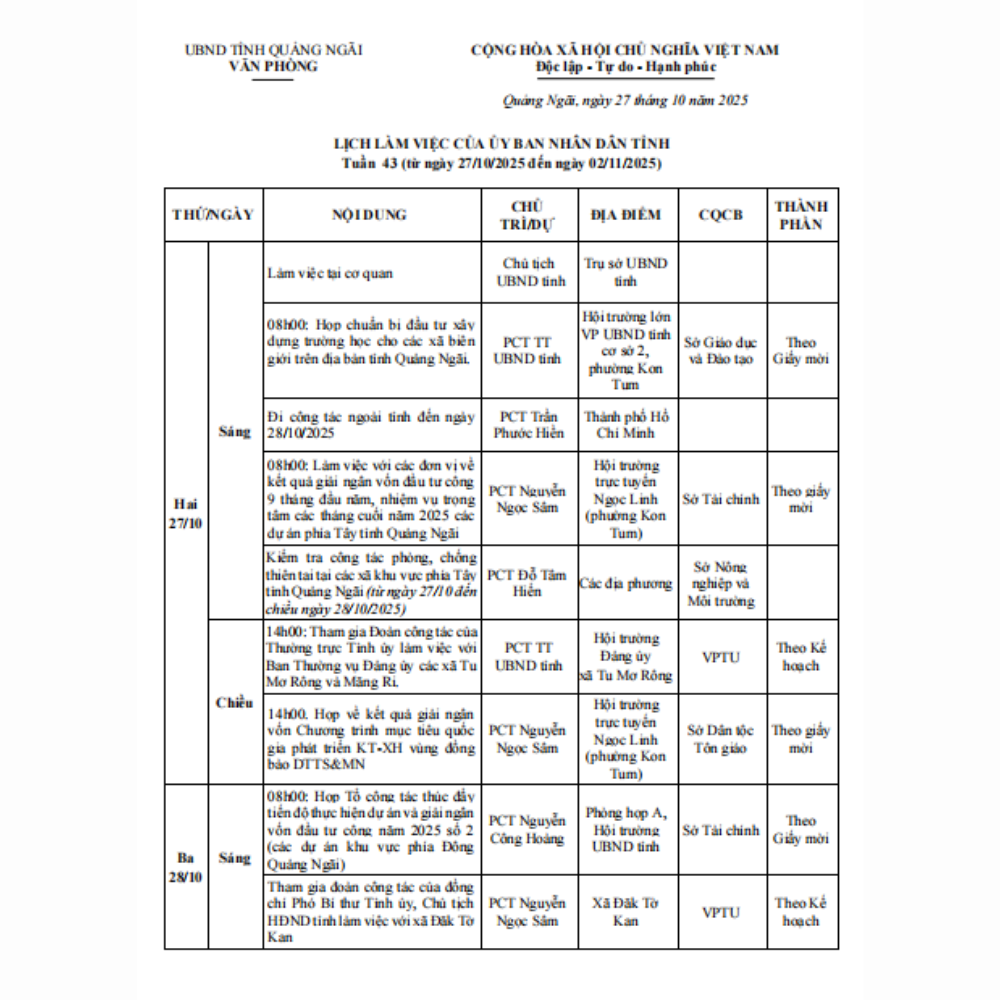 Lịch làm việc của UBND tỉnh Quãng Ngãi - Tuần 43 (từ ngày 27/10/2025 đến ngày 02/11/2025)