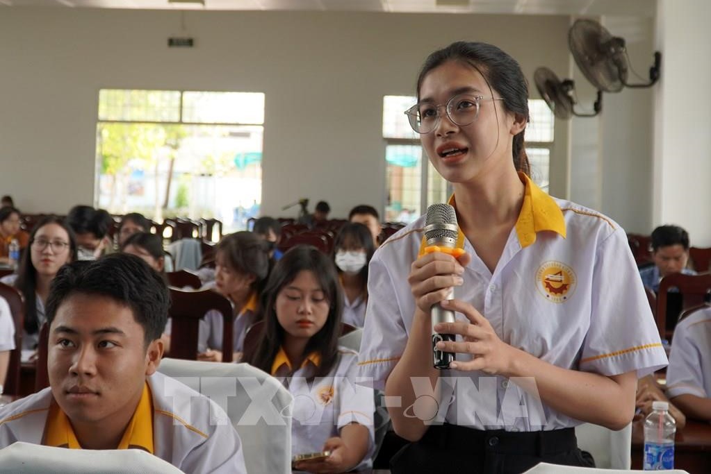 Sinh viên trường Cao đẳng Kiên Giang đặt câu hỏi cho ban tổ chức. Ảnh: Văn Sĩ - TTXVN