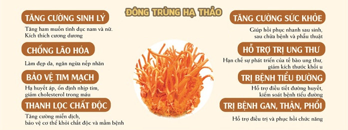 Với những bằng chứng này, công dụng của đông trùng hạ thảo giống như thuốc cường dương, tăng cường sinh lực tự nhiên của nam giới. Bên cạnh đó đông trùng hạ thảo cũng có tác dụng điều hoà nội tiết tố, cải thiện triệu chứng lạnh tử cung, vô sinh…ở nữ giới.